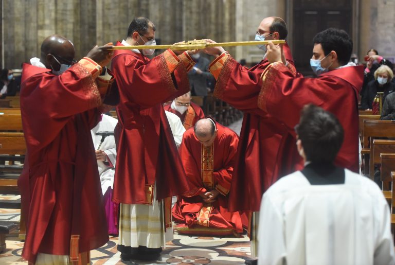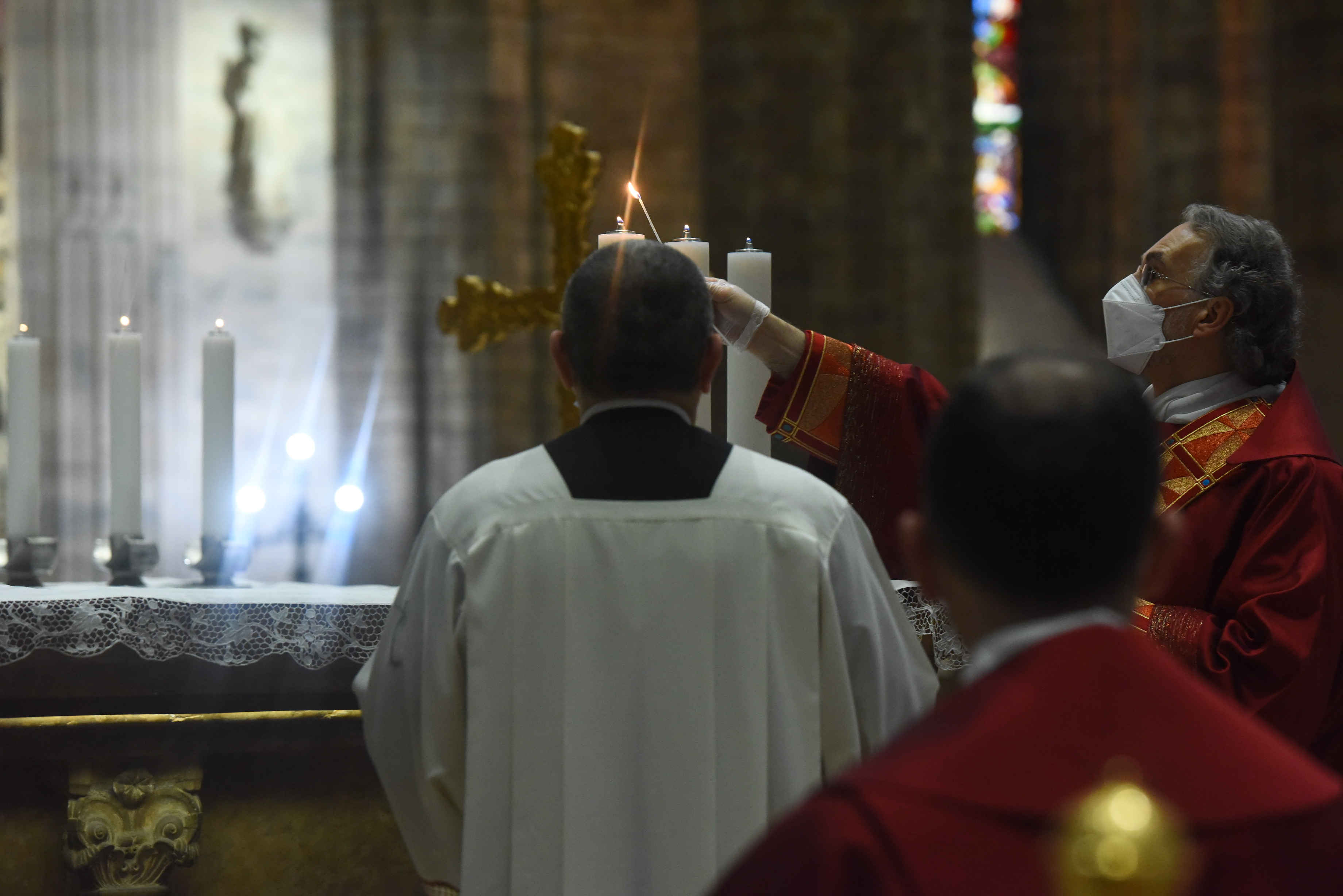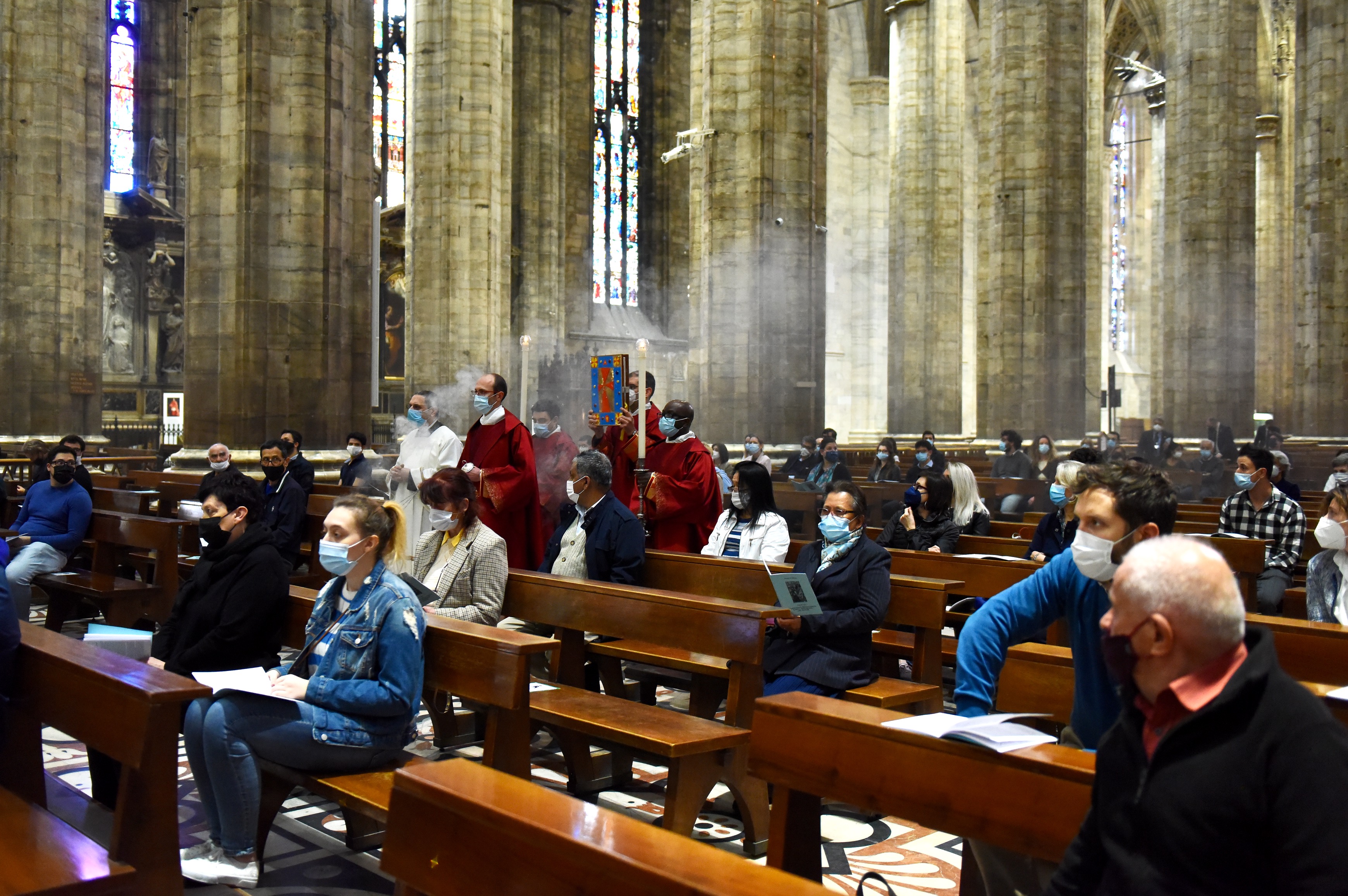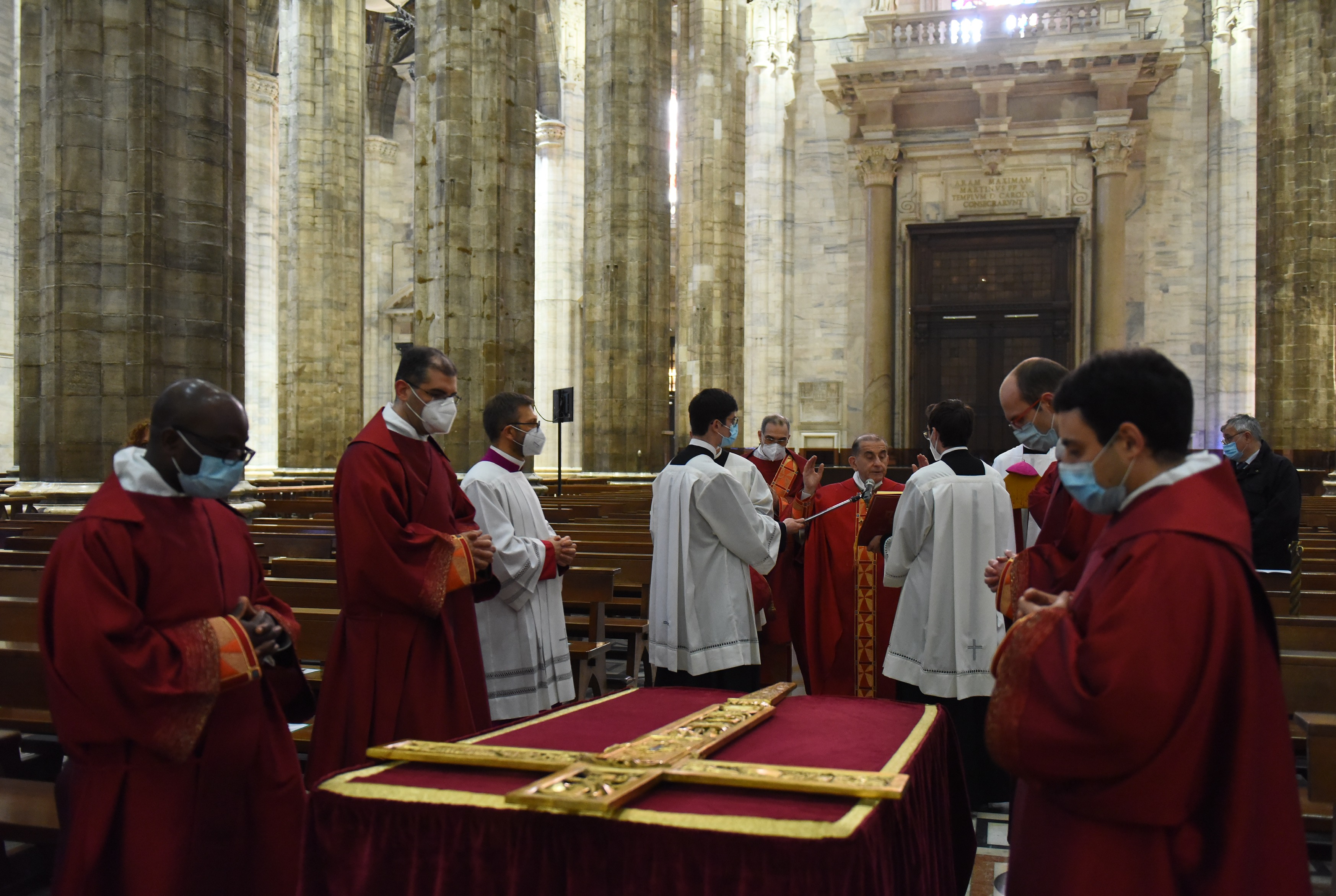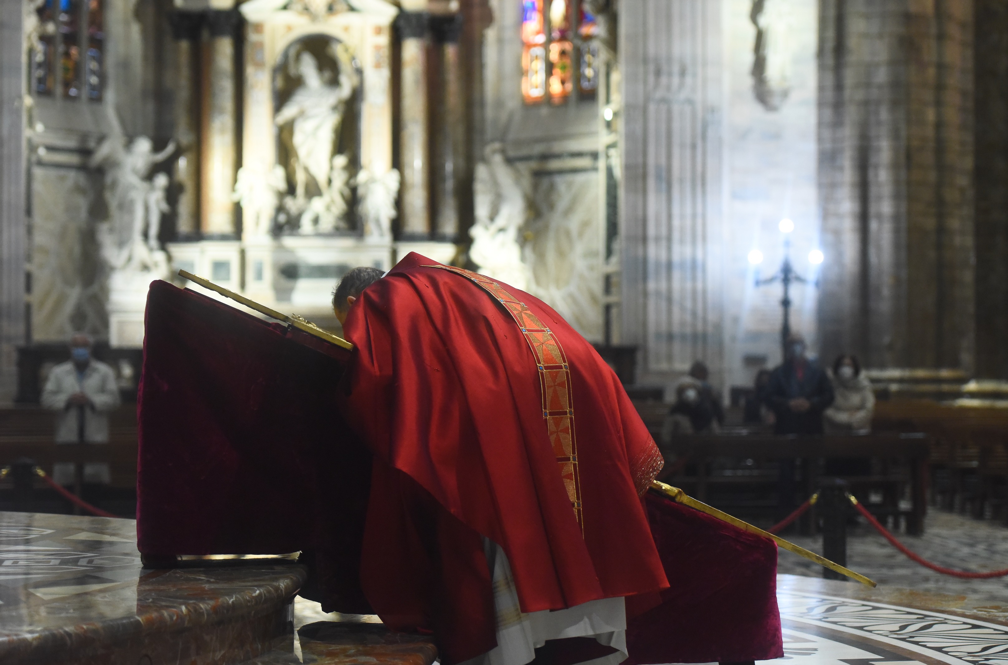 Poi, l’adorazione della Croce, portata in processione dall’ingresso del Duomo fino all’altare maggiore e baciata dal solo Arcivescovo, per le norme antipandemiche. Dalla preghiera universale con le sue undici orazioni – che paiono abbracciare il mondo intero, dal Papa ai fratelli maggiori ebrei, dai cristiani di tutte le Confessioni a chi non crede, dai governanti, ai malati e ai defunti -, si arriva, infine, al ricordo della Deposizione del Signore che guida a contemplare la scena della sua sepoltura, quando, dopo la lettura dal Libro del profeta Daniele e la conclusione, ancora dal racconto di Matteo della Deposizione nel sepolcro, cala il silenzio e viene velata la Croce, con un Rito ancora una volta peculiare della Cattedrale, a indicare la discesa di Cristo agli inferi.