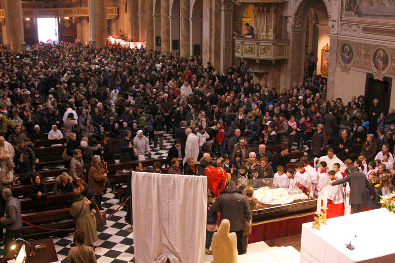 Nella primissima mattinata, prima di andare a scuola, hanno pregato 300 ragazzi delle medie e delle superiori, guidati da don Tommaso Nava, coadiutore della parrocchia di Valmadrera, e da don Filippo Dotti, responsabile della Pastorale giovanile del Decanato di Lecco. Poi, dalle 7.30, una processione interminabile, a tal punto che a un certo punto la folla è arrivata a occupare anche la scalinata della Basilica, creando non pochi problemi alla viabilità della zona. Fede, curiosità, devozione, impegno educativo, desiderio di pregare e di trarre forza da una delle figure esemplari più amate: davvero tantissimi e innumerevoli sono stati i motivi che hanno spinto migliaia di lecchesi a fermarsi a pregare davanti all’urna del Santo dei giovani, facendo vivere alla città una giornata che non si vedeva da anni per la sua intensità e la sua partecipazione. Tra i presenti, particolarmente numerosi anche i gruppi dell’Istituto Maria Ausiliatrice e del Collegio Volta, accompagnati da insegnanti, religiose e religiosi.
