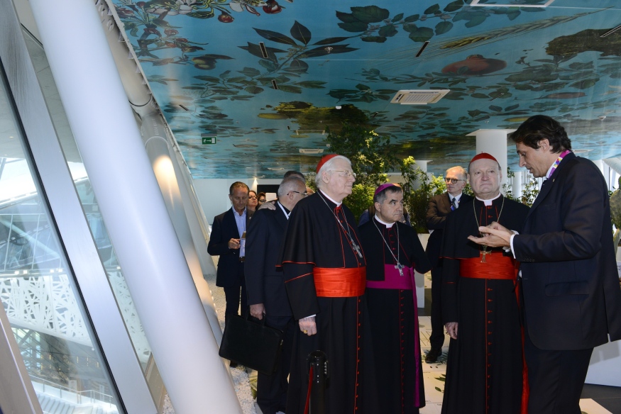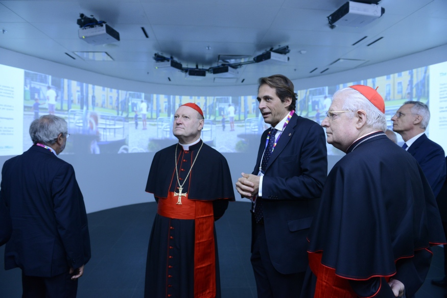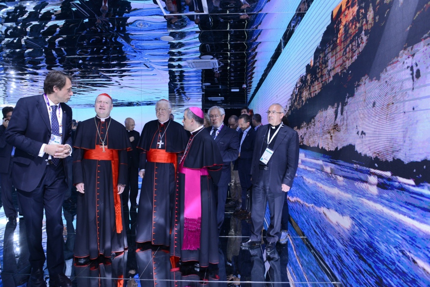Le bellezze naturali e architettoniche del nostro Paese accolgono la delegazione ufficiale del National Day della Santa Sede al Padiglione Italia. Così, alla fine della cerimonia d’inaugurazione, i Cardinali, i Vescovi, gli ambasciatori che entrano, guardano con attenzione e curiosità, sostano, commentano. Per esempio di fronte al “mare” virtuale fatto di giochi di luce, che parla delle nostre coste che hanno reso il turismo italiano famoso nel mondo.