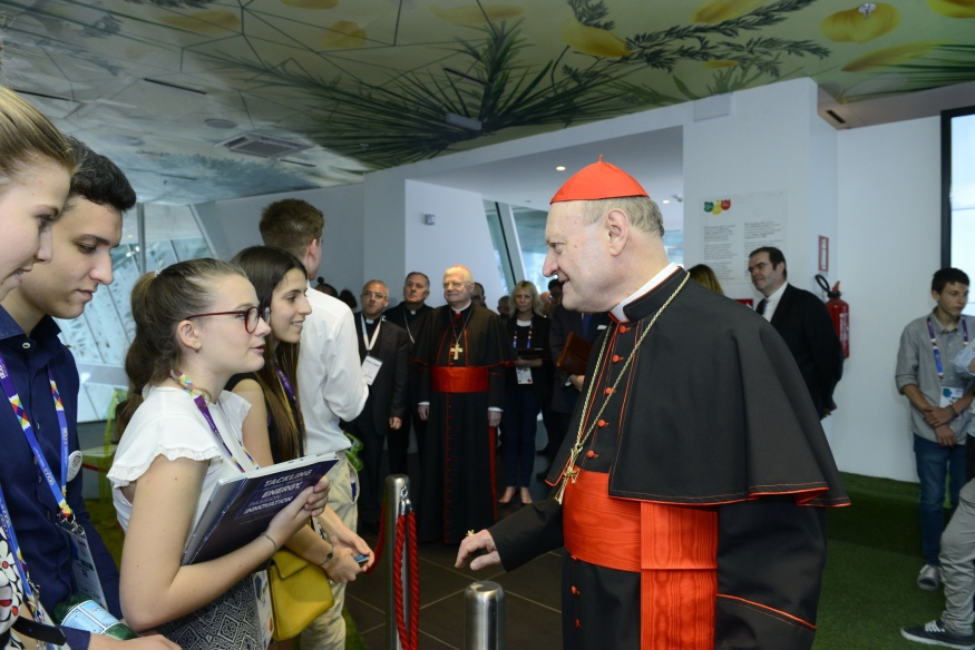 Ma guardano anche, con sgomento, le immagini del crollo della Basilica superiore di Assisi, devastata dal terremoto del 1997 e oggi riportata a splendore. Di fronte al filmato, il cardinale Scola osserva in silenzio. Sorride, invece, transitando tra le aree del Padiglione, differenti tra loro, ma tutte belle colorate, evocative.