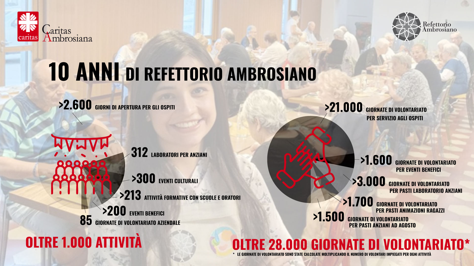 La storia di dieci anni di Refettorio Ambrosiano, se affidata ai numeri, si può considerare una storia di successo. Ma il senso di un’esperienza tanto poliedrica si ricava soprattutto dai volti e dalle storie delle migliaia di persone accolte, sfamate, aiutate, coinvolte, sensibilizzate, orientate. E dalle riflessioni di coloro che, dopo averla promossa, l’hanno accompagnata per un intero decennio.