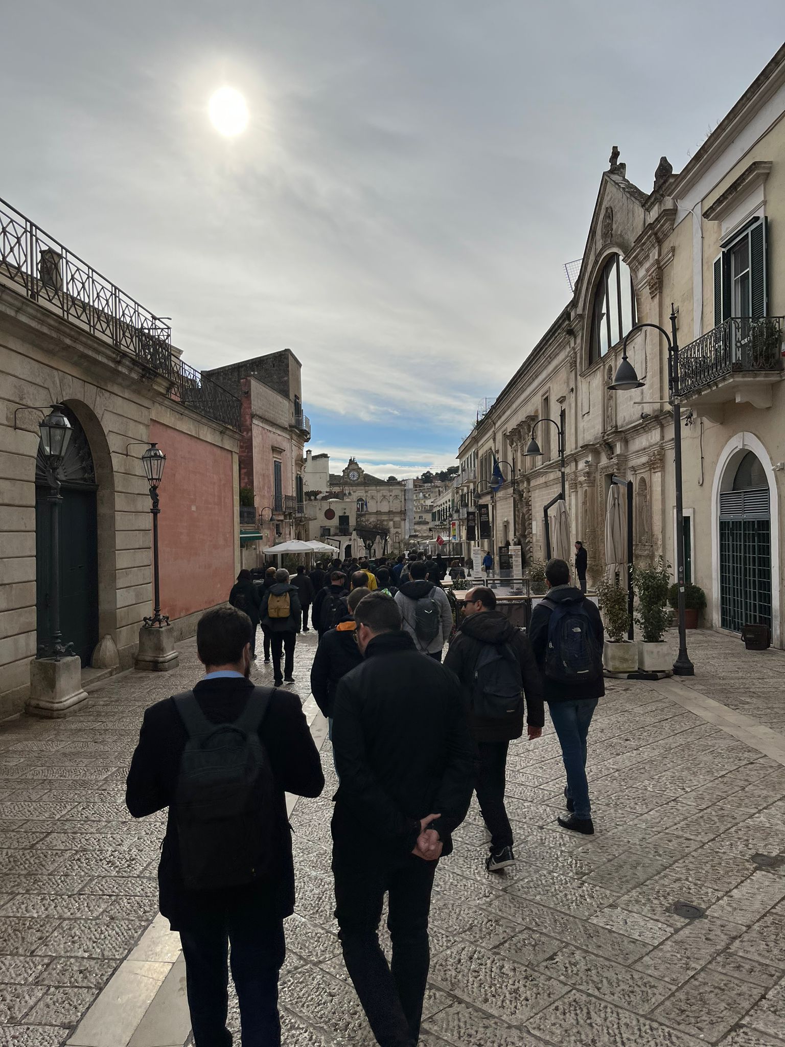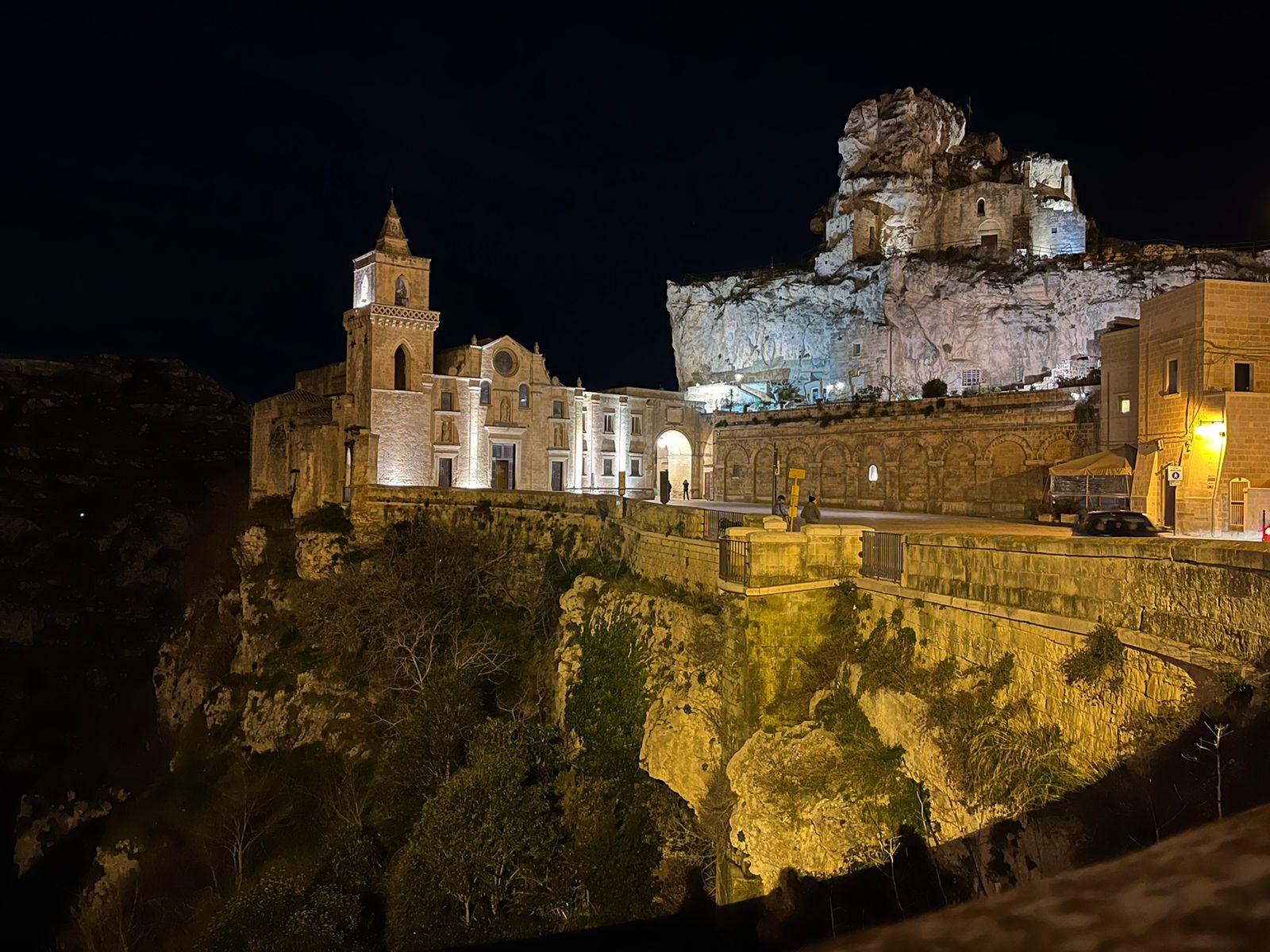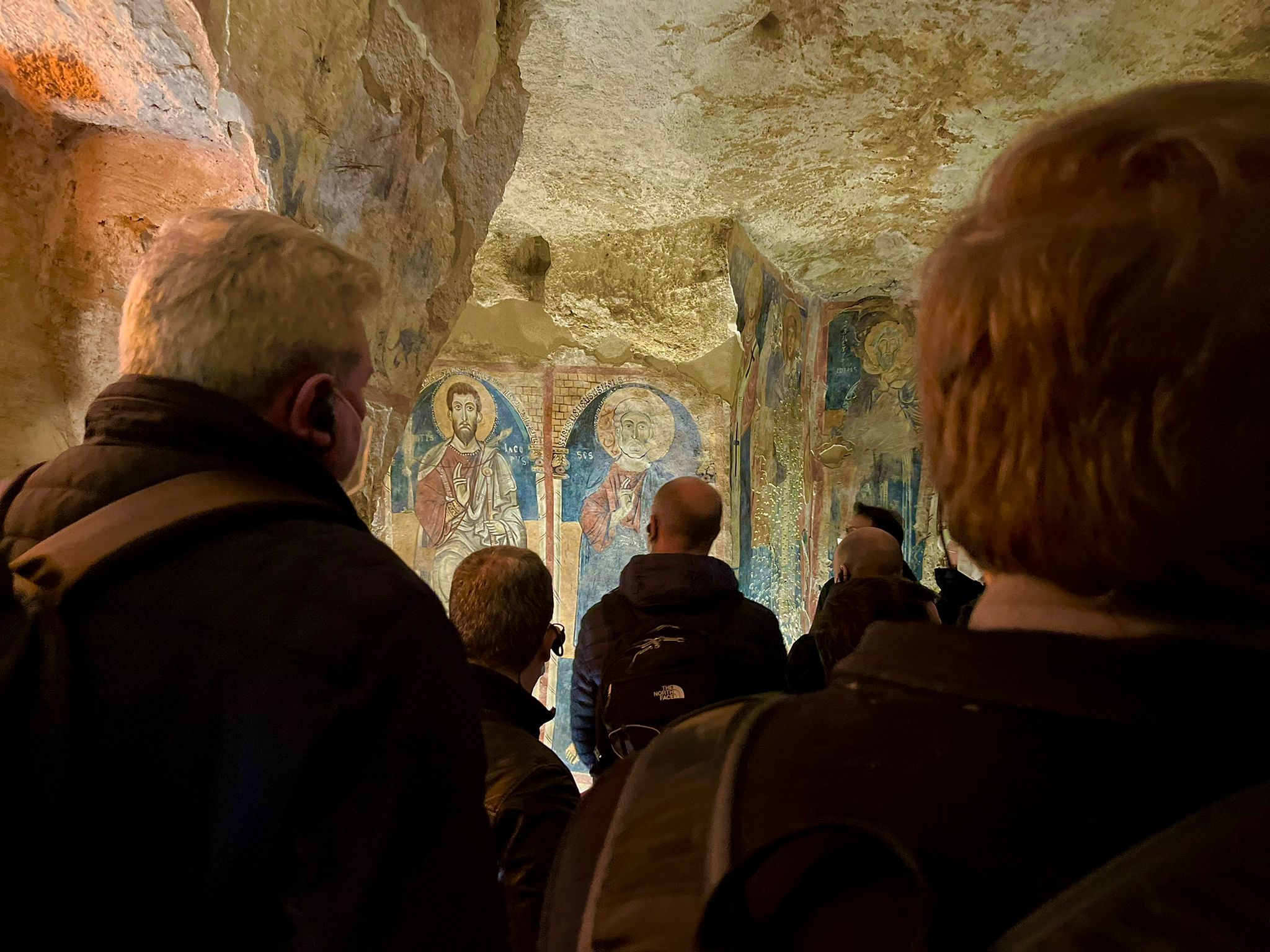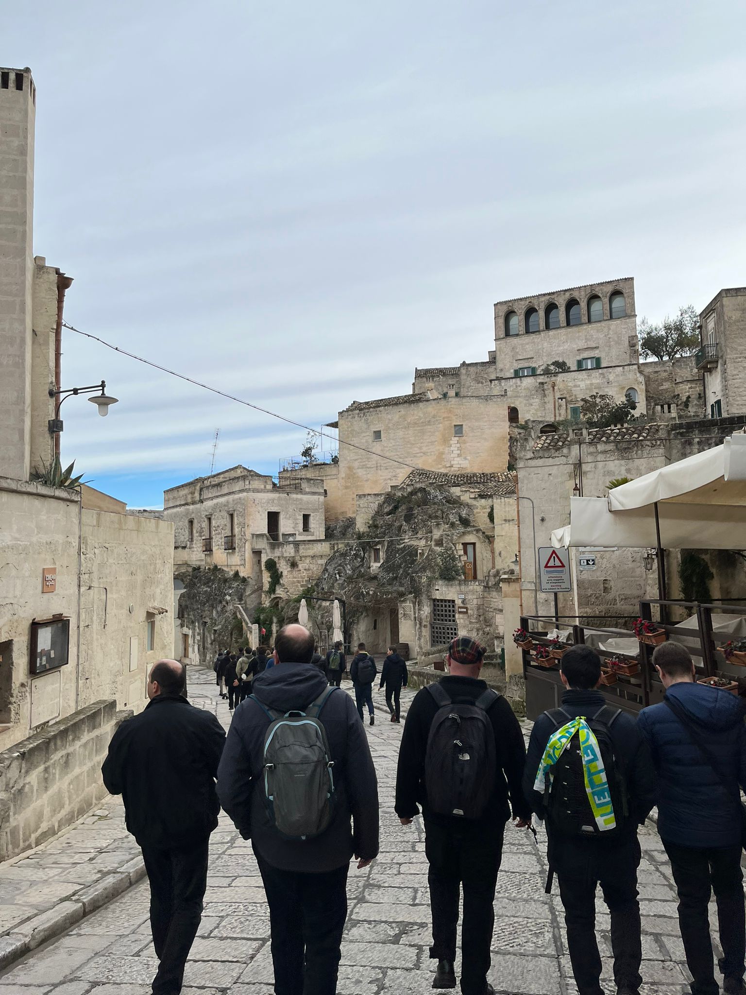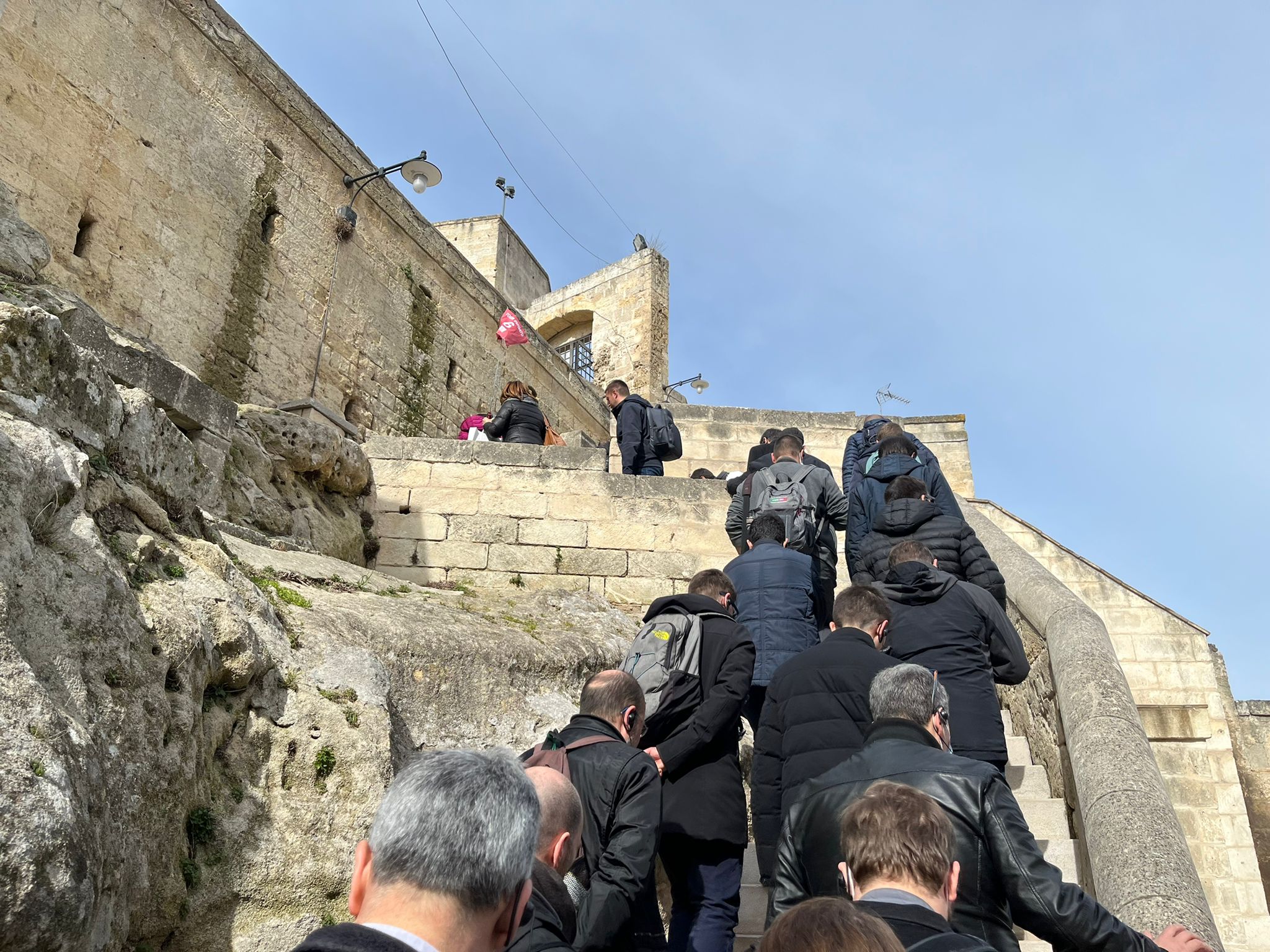 Matera è la meta del quarto giorno e Casa Sant’Anna (casa diocesana) il punto di partenza. Da qui ci spostiamo alla chiesa di San Pietro in Caveoso, dove ci accoglie monsignor Antonio Caiazzo, Arcivescovo di Matera-Irsina, che ci introduce alla storia della città. Anche la chiesa, come il centro abitato, ha vissuto momenti di abbandono (Matera fu definita addirittura la «vergogna d’Italia»), per poi però rifiorire e diventare un’importante meta turistica. Qui ci concediamo una sosta orante, grazie alla meditazione di monsignor Valagussa.