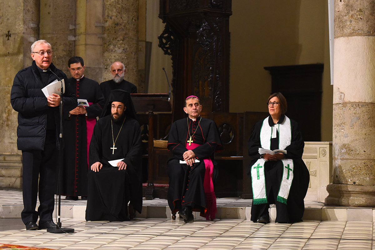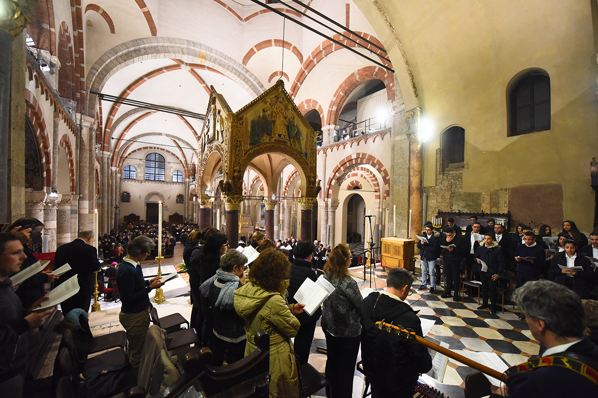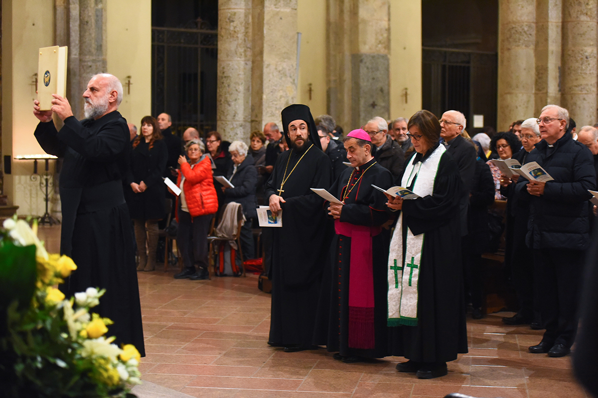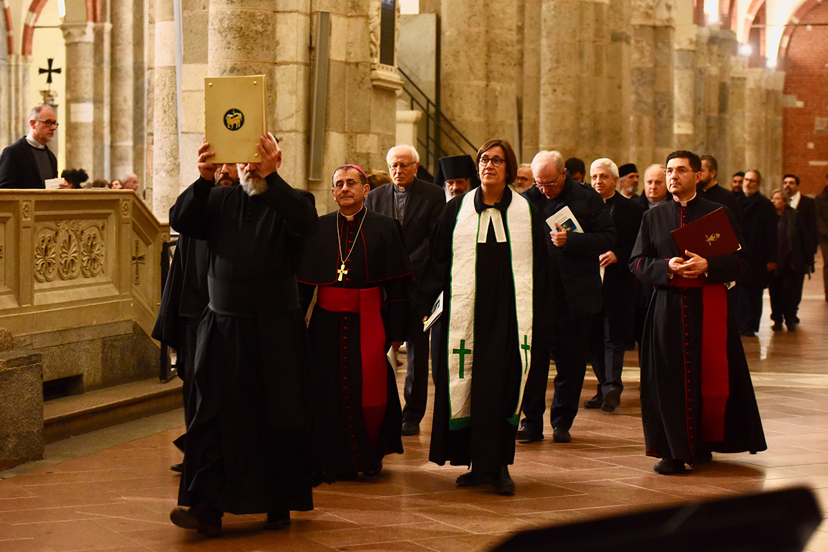 Come quella svoltasi ieri sera nella Basilica di Sant’Ambrogio, a cura del Consiglio delle Chiese cristiane di Milano e con la partecipazione di tutti i Delegati e di molti altri fedeli. Sotto lo sguardo ideale di Ambrogio, padre della Chiesa indivisa, la celebrazione viene presieduta dall’Arcivescovo, dall’Archimandrita del Patriarcato ecumenico di Costantinopoli Teofilactos Vitsos (presidente di turno del Cccm) e dalla pastora metodista Dorothee Mack. Le suggestive melodie delle diverse tradizioni, eseguite dai cori della Chiesa copta, di quella ortodossa russa e del Movimento dei Focolari, animano la serata, aperta dall’ingresso processionale dei Ministri che seguono il Libro dei Vangeli, portato dal diacono permanente Roberto Pagani, responsabile del Servizio diocesano per l’ecumenismo e il dialogo Interreligioso. Molti i concelebranti, tra cui monsignor Ambrogio Spreafico, vescovo di Frosinone e presidente della Commissione episcopale Cei per l’ecumenismo e il dialogo interreligioso, il direttore dell’Ufficio Cei don Giuliano Savina e il vicario episcopale di settore monsignor Luca Bressan.
