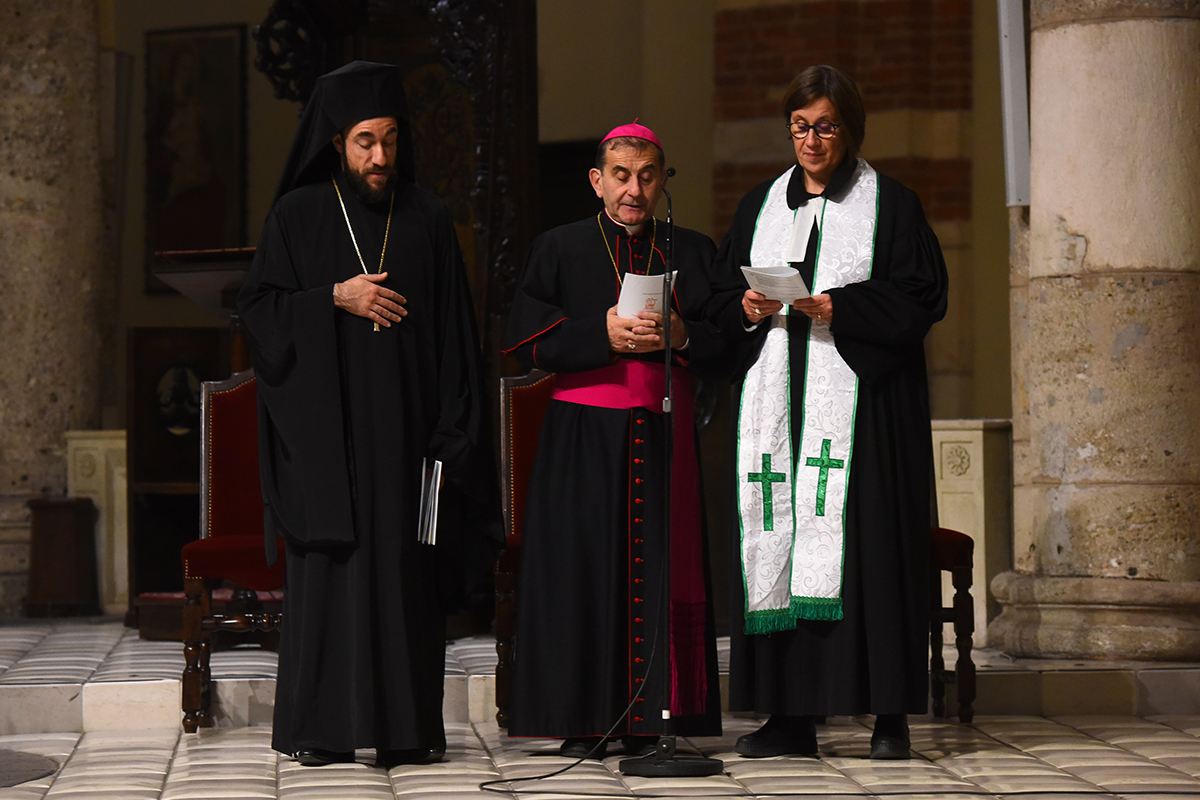 «La Basilica di Sant’Ambrogio non è nuova a eventi di questo tipo e abbiamo sempre considerato un vanto ospitarli – dice nel suo saluto l’abate della Basilica, monsignor Carlo Faccendini -. Trovarsi insieme è una delle buone pratiche di quel vero cammino ecumenico che costringe tutti a tornare alle radici della fede. Non credo che ci sia altro luogo, a Milano, migliore di questo, dove si prega da più di 1600 anni e a cui i milanesi guardano come radice della loro vita di cristiana, per pregare insieme». L’archimandrita Vitsos dà il benvenuto a nome del Cccm (19 le Chiese aderenti), sottolineando «la spiritualità del momento che si sta vivendo» e ricordando la preghiera che da tre anni, la domenica dopo l’1 settembre in occasione della Giornata per la custodia del Creato, vede riuniti i rappresentanti delle Chiese presenti in città.