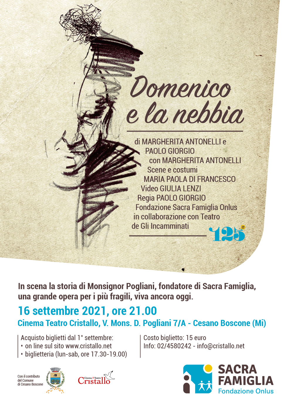 Il prossimo appuntamento è giovedì 16 settembre, alle 21, presso il Cinema teatro Cristallo di Cesano Boscone (via mons. Domenico Pogliani 7/a), dove andrà in scena lo spettacolo Domenico e la nebbia, con Margherita Antonelli, che ne è anche autrice insieme al regista Paolo Giorgio, che è anche regista) e protagonista è Margherita Antonelli.