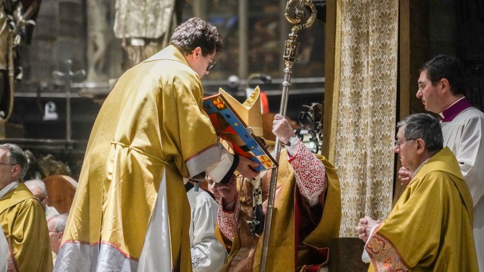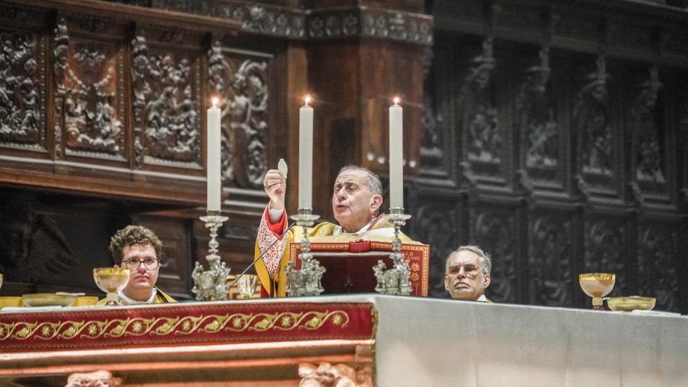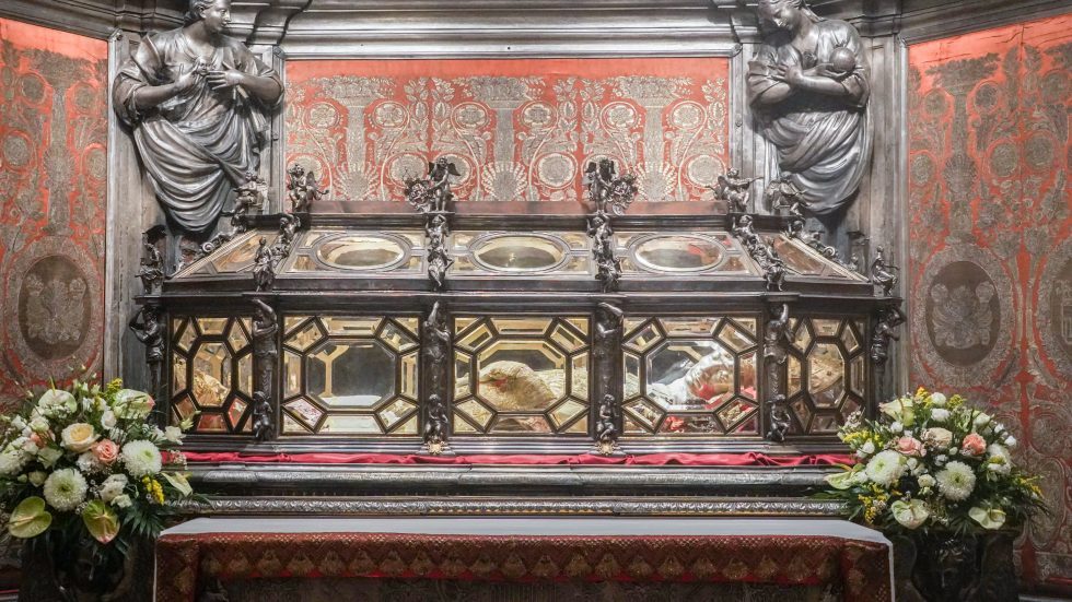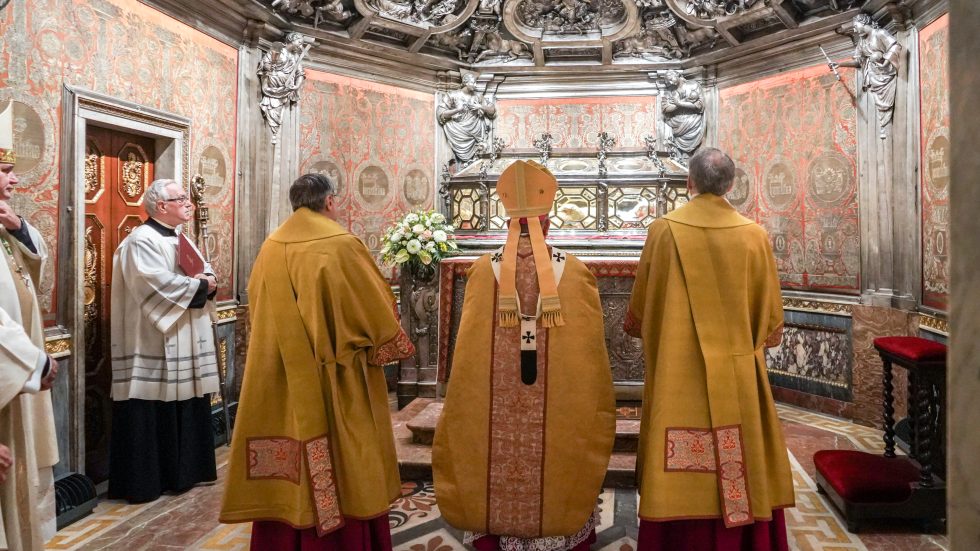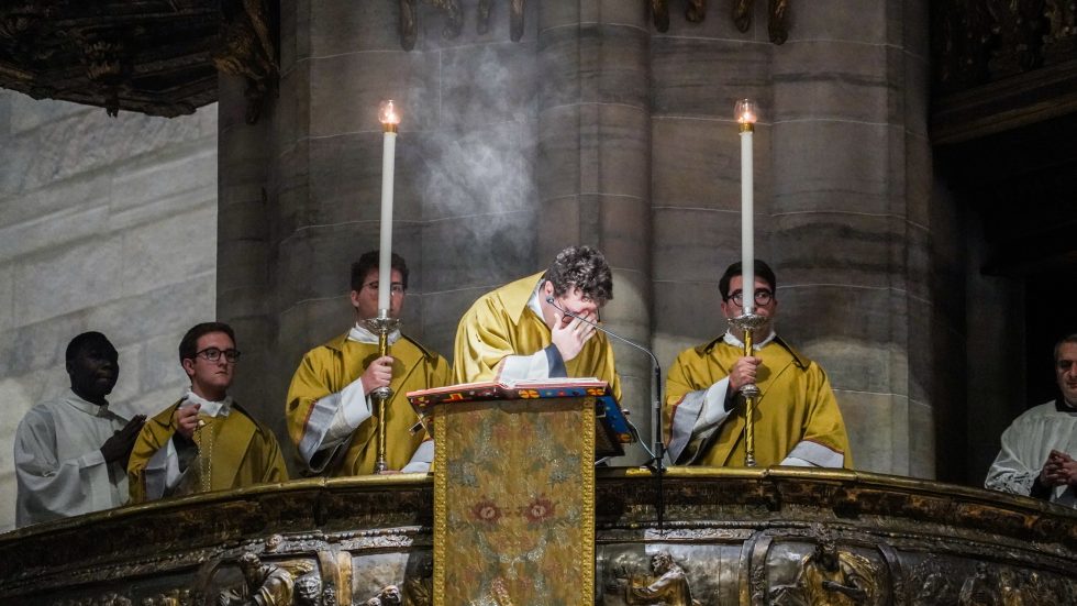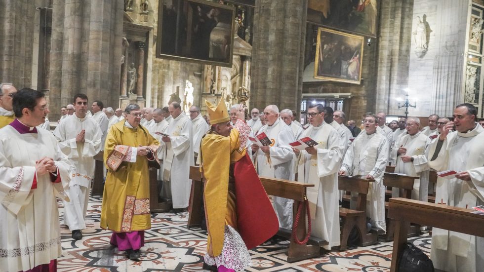 Alle spoglie di San Carlo – conservate nello Scurolo sottostante l’altare maggiore del Duomo – l’Arcivescovo, con 8 vescovi, rende omaggio incensando l’urna e cantando la Sallenda prima che inizi la Messa, concelebrata dai membri del Cem, dai Canonici del Capitolo della Cattedrale e da altri presbiteri per un totale di oltre 100 sacerdoti. Molti i segni che parlano visivamente del Santo – l’Arcivescovo porta il suo pastorale e ne indossa l’anello, il pallio, la preziosissima e restaurata casula cinquecentesca con la croce pettorale donata da Maria Teresa d’Austria -, oltre alla presenza di rappresentanti delle istituzioni fondate o rifondate dal Borromeo: il rettore del Seminario don Enrico Castagna (accompagnato dai diaconi e dai seminaristi), il prevosto degli Oblati di San Carlo padre Giulio Binaghi, il Moderator Curiae monsignor Carlo Azzimonti e l’Arciprete del Duomo monsignor Gianantonio Borgonovo.