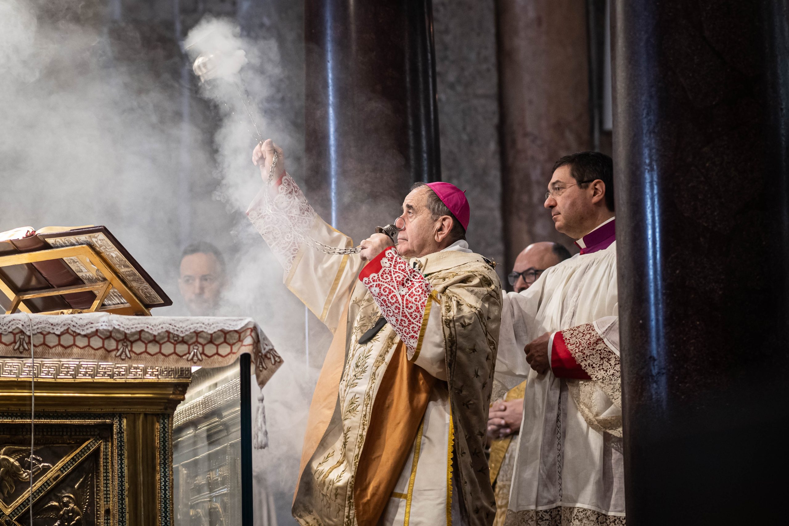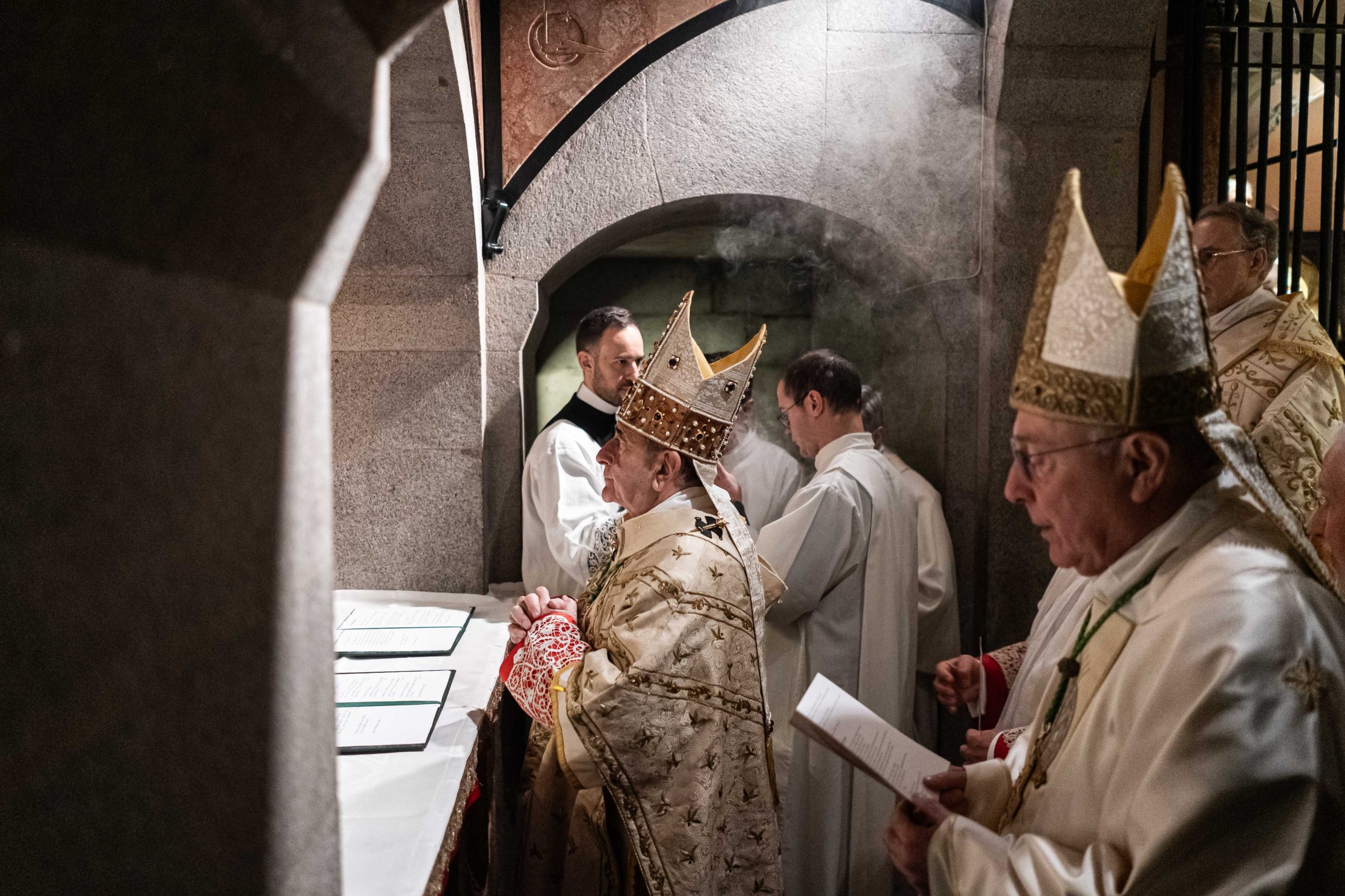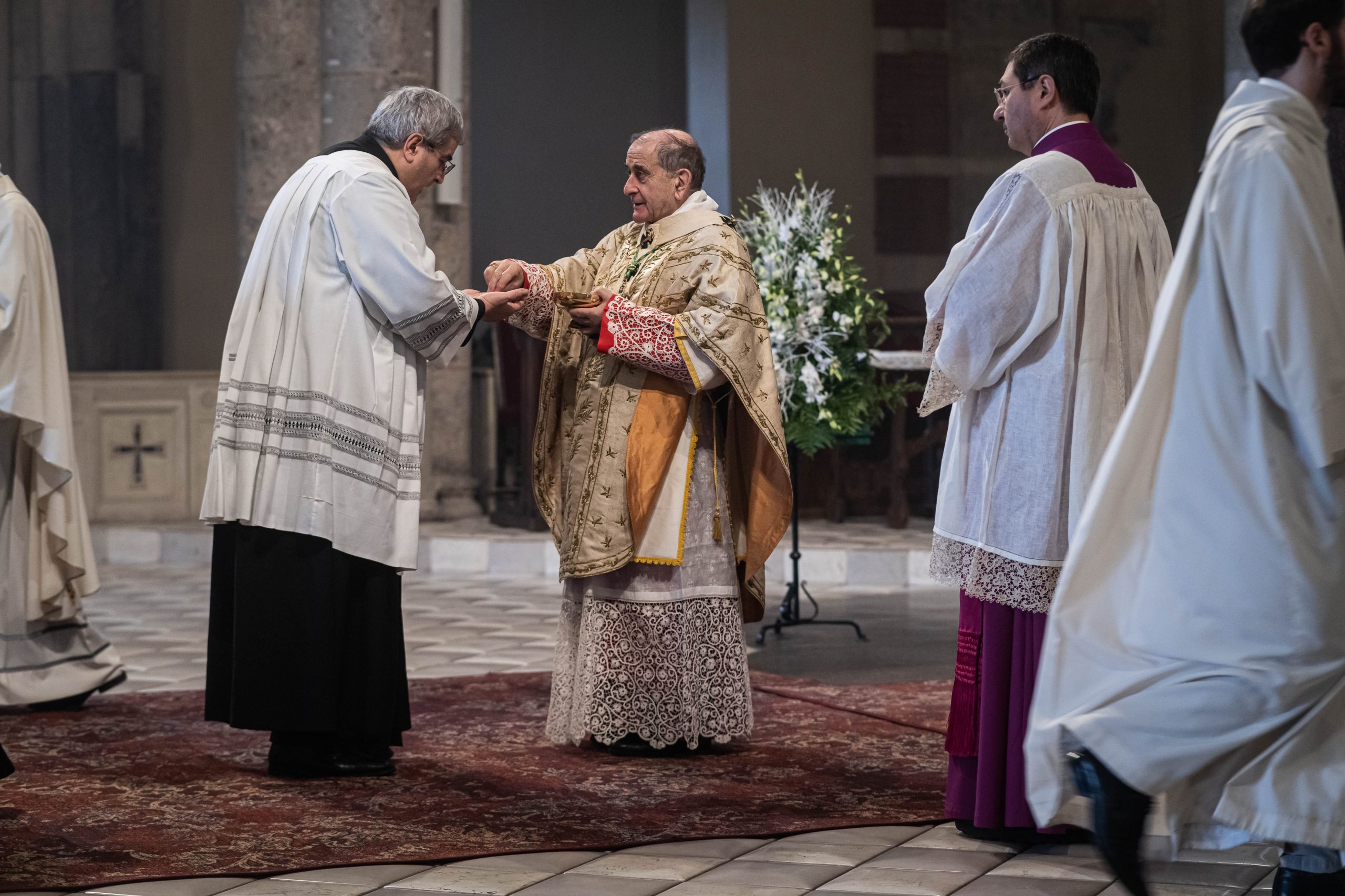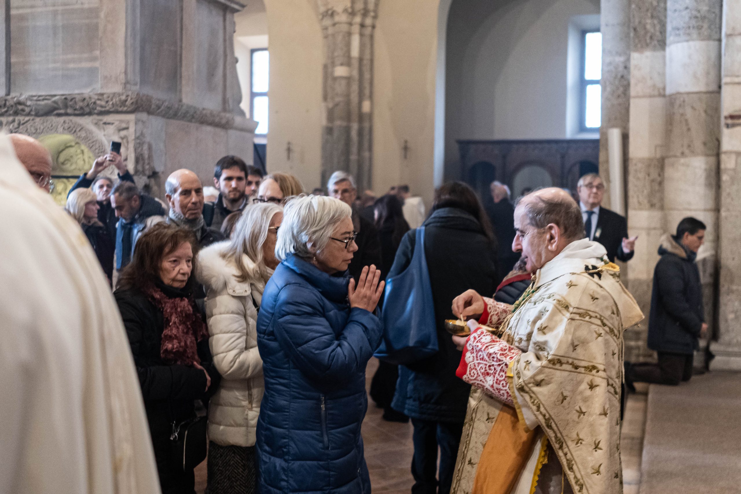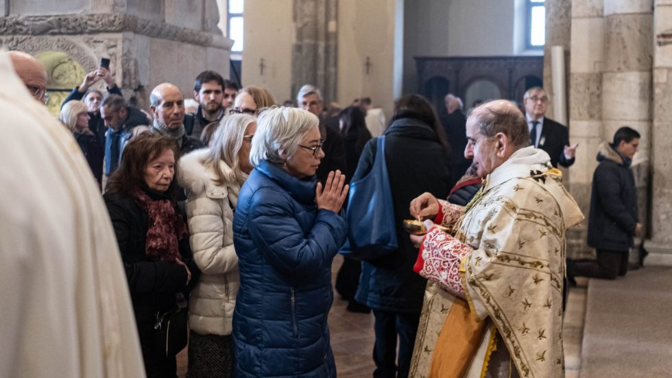 Poi, al termine dell’Eucaristia, la discesa del vescovo Delpini e dei concelebranti, nella cripta per la preghiera a sant’Ambrogio, con le parole tratte dal “De Virginibus” e le intercessioni di fronte alle reliquie del santo e dei martiri Gervaso e Protaso. Arriva anche un annuncio: infatti, il vescovo Delpini rende noto che è in via di pubblicazione la versione latina della II Edizione del Messale ambrosiano entrato in vigore, in Diocesi, il 17 novembre 2024.