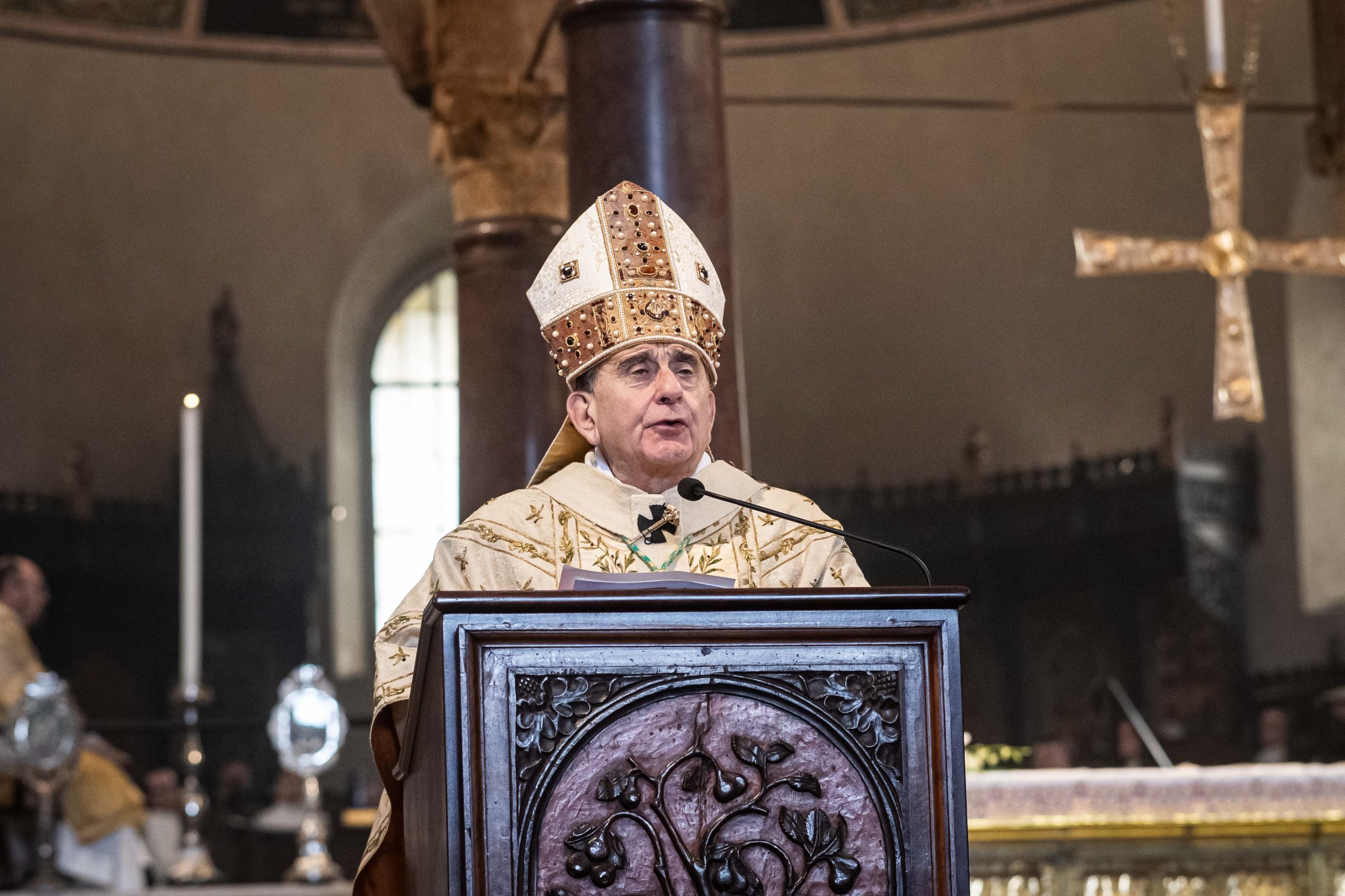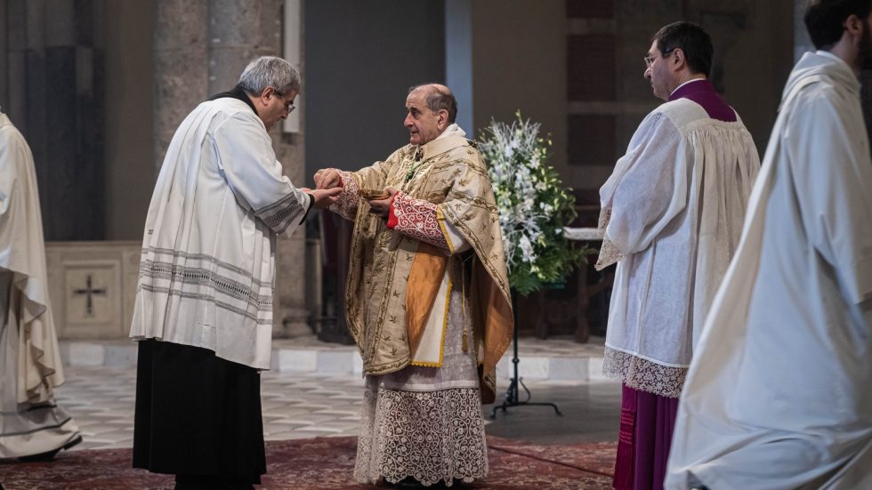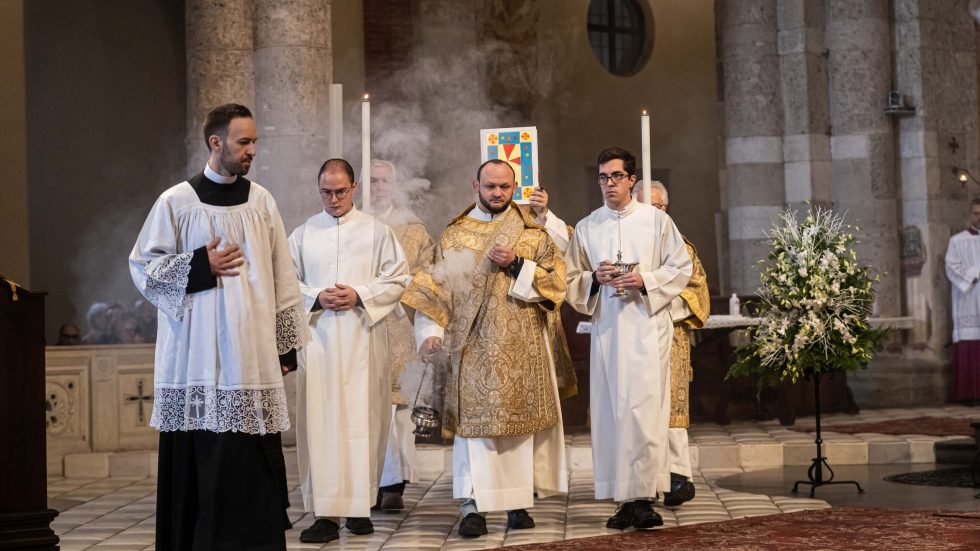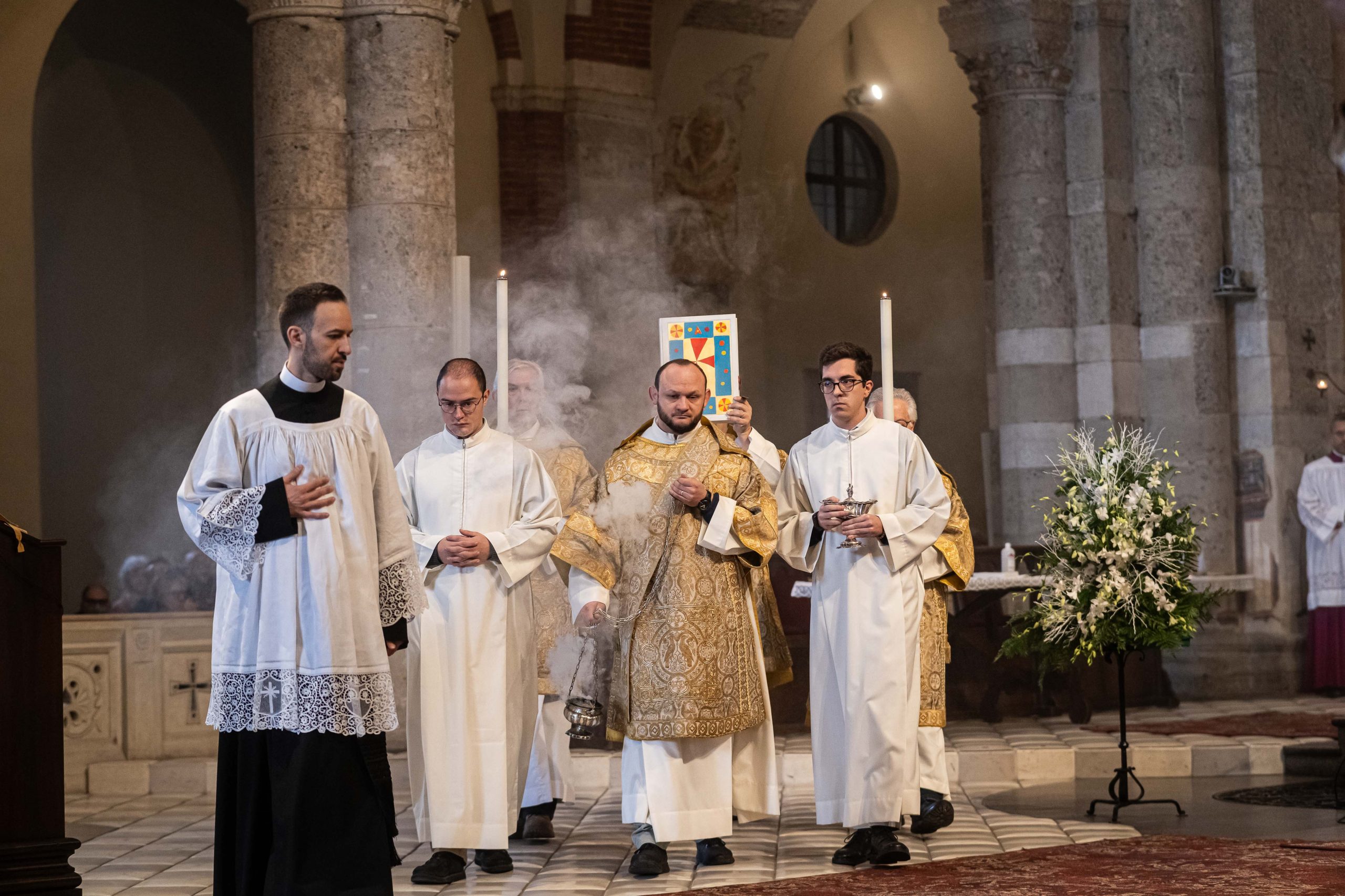 È l’Arcivescovo che presiede la Messa solenne concelebrata dall’abate di Sant’Ambrogio, monsignor Carlo Faccendini, dall’arciprete del Duomo, monsignor Gianantonio Borgonovo e dai Canonici dei due rispettivi Capitoli, a porre questo interrogativo, la cui risposta è una sola e scandita con le parole dello stesso Ambrogio, nella sua famosa espressione, “Cristo è tutto per noi”. La frase tratta dal trattato “De Virginibuis”, che – ricorda il vescovo Mario Delpini – i candidati ambrosiani al presbiterato 2026 hanno scelto come loro motto.