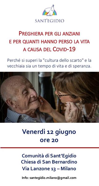 Venerdì 12 giugno, alle 20, la Comunità di Sant’Egidio invita tutti a una preghiera per gli anziani e per quanti hanno perso la vita per il Covid-19. La preghiera si svolge presso la chiesa di San Bernardino alle Monache (via Lanzone 13 – M2 Sant’Ambrogio), dove la Comunità ha ripreso la preghiera serale nel rispetto delle normative sanitarie. È possibile partecipare alla preghiera oppure seguire la diretta sulla pagina Facebook sulla pagina della Comunità di Sant’Egidio Milano.