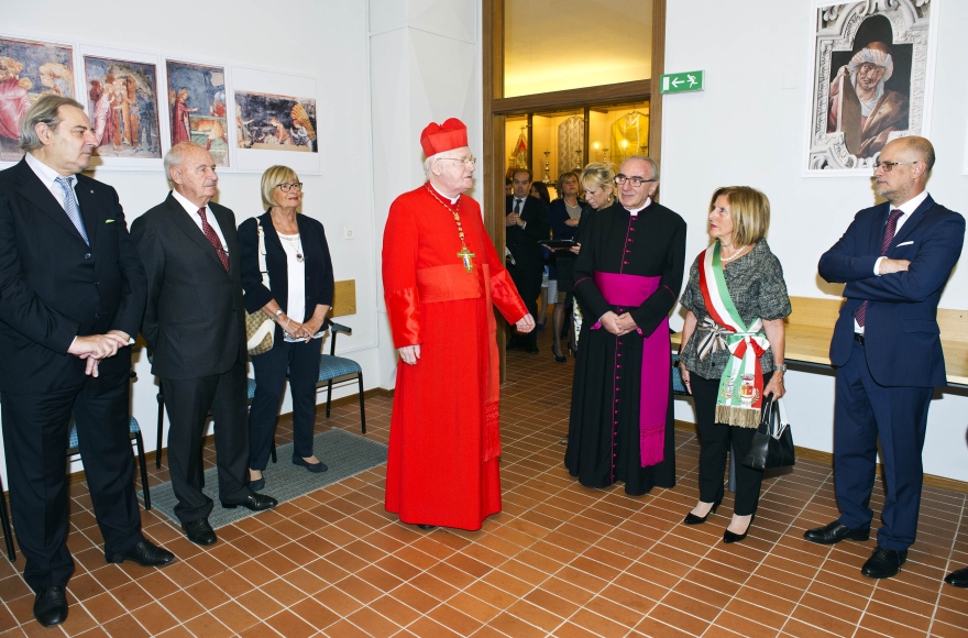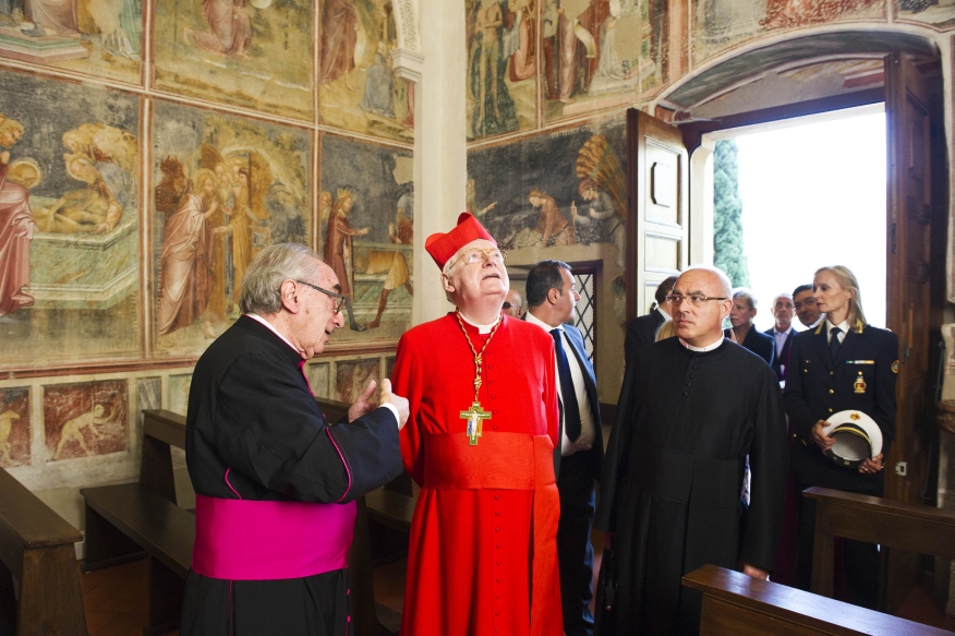 Infine, la breve sosta al Santuario della Madonna dei Ghirli – “delle Rondini” o dei “Rondoni” – con lo sguardo ammirato del Cardinale che, seguendo le spiegazioni del Prevosto, ripercorre la storia dei recentissimi restauri delle pitture murarie risalenti, le più antiche, al Trecento e alla scuola giottesca, mentre del XV secolo è la statua lapidea mariana che si offre da secoli alla devozione dei fedeli.