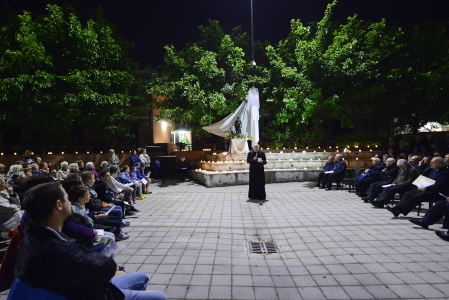 Nella piazza della fontana di Muggiano, in una sorta di moderna corte all’aperto, la semplice statua della Madonna, cui fanno da corona luminosa tante piccole fiammelle, accoglie tutti, non solo gli oltre 150 fedeli riuniti per l’occasione, ma anche la gente che