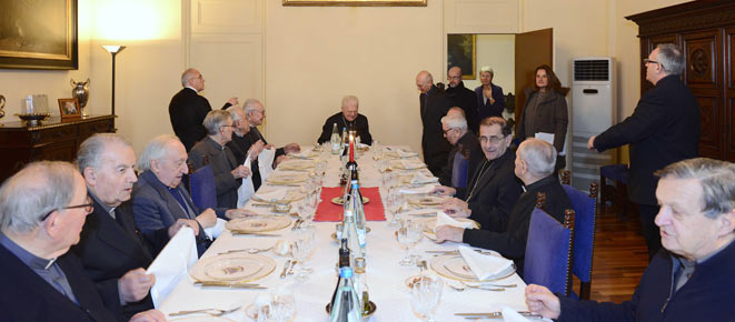 Al termine del Pontificale dell’Epifania presieduto in Duomo, in Arcivescovado il cardinale Scola ha accolto 13 sacerdoti ultranovantenni e ha pranzato con loro. «È una grande gioia per me avere questa possibilità di stare con voi – ha detto accogliendo gli anziani confratelli -. Siete una ricchezza per la nostra Chiesa, mi date la possibilità con questo segno di esprimere la mia gratitudine per quanto avete fatto e per il servizio che ancora rendete alla Chiesa». Durante il pranzo e l’incontro, durati quasi tre ore, il cardinale Scola e i preti hanno dialogato raccontando del proprio lungo ministero e dell’attività pastorale che ancora svolgono.