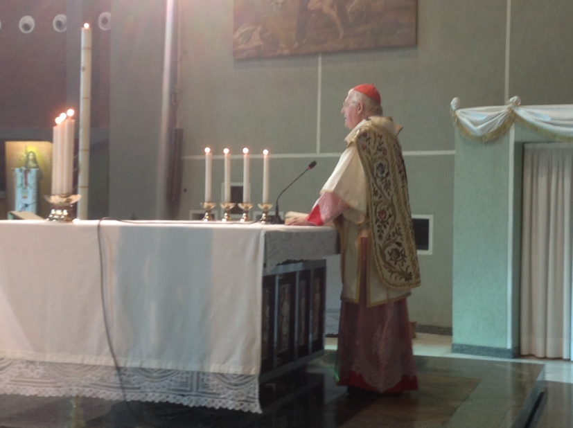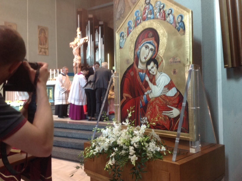 Il cardinale, che presiede la Celebrazione nella bella e affollatissima chiesa della Natività di Maria Vergine, per la Comunità pastorale Maria Madre della Speranza, a Verghera di Samarate, saluta così i fedeli riuniti. È la festa patronale e le quattro parrocchie, quella in cui ci trova, la Santissima Trinità (la più grande), Cascina Elisa e San Macario, sono tutte presenti, così come i sindaci di Samarate e di Ferno, perché San Macario e nel territorio fernese. La devozione alla grande icona di Maria Madre della Speranza, posta sull’altare è evidente, tanto che all’Arcivescovo verrà, a conclusione, donata una piastrella del 1779 appartenente all’antico pavimento della chiesa della Trinità, con riprodotta la stessa immagine.