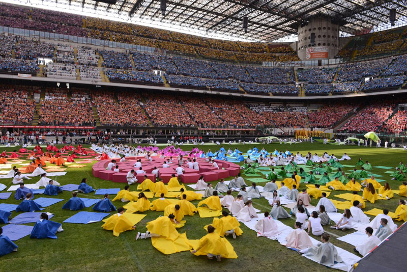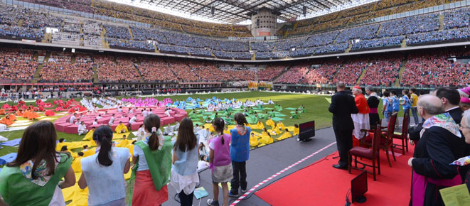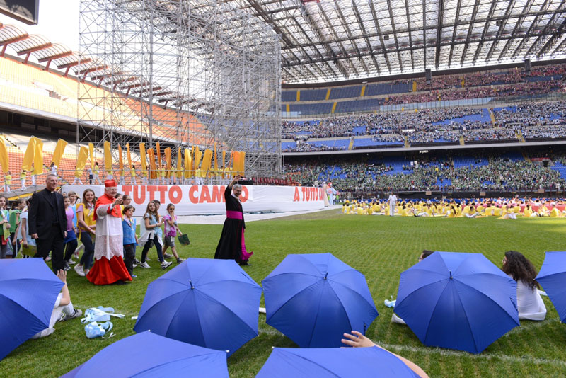 Emblema dell’esistenza di ogni giorno dove esiste il grano, ma anche la zizzania, il bene, ma anche il male. E ben si capisce che l’Arcivescovo non alluda solo alle coloratissime scenografie – particolarmente suggestiva quella dei tre servi della Parabola evangelica, immaginati come giganti in dialogo drammatizzato tra loro –, alle sonorità davvero da arena del calcio, o alla felice idea di agitare i cartoncini colorati, che così paiono ricoprire gli spalti, durante la lettura del Vangelo, con il giallo del grano e il verde.