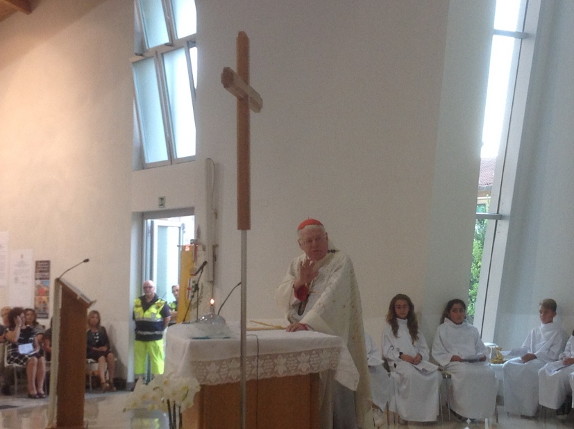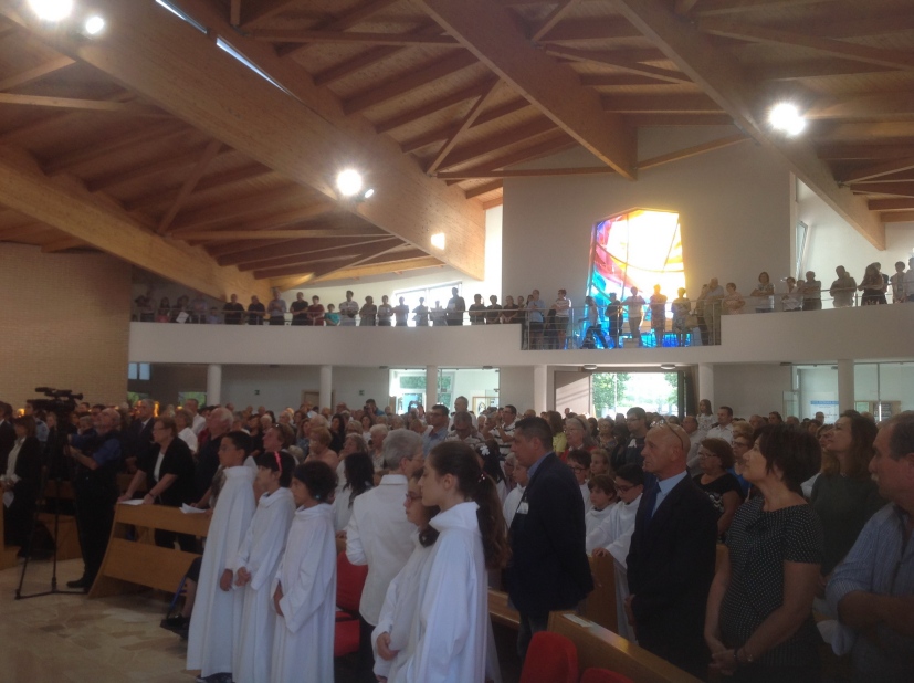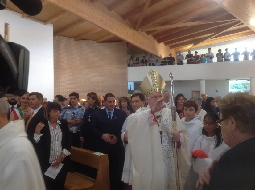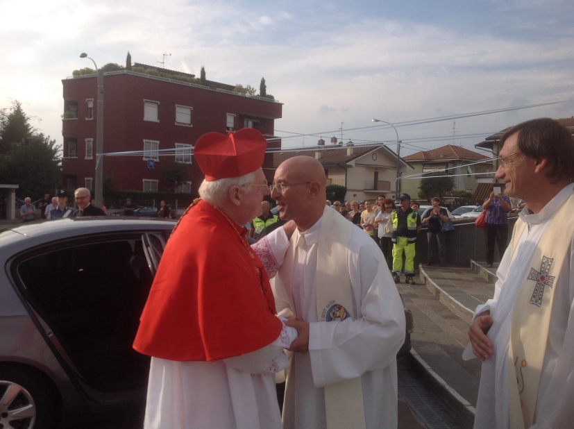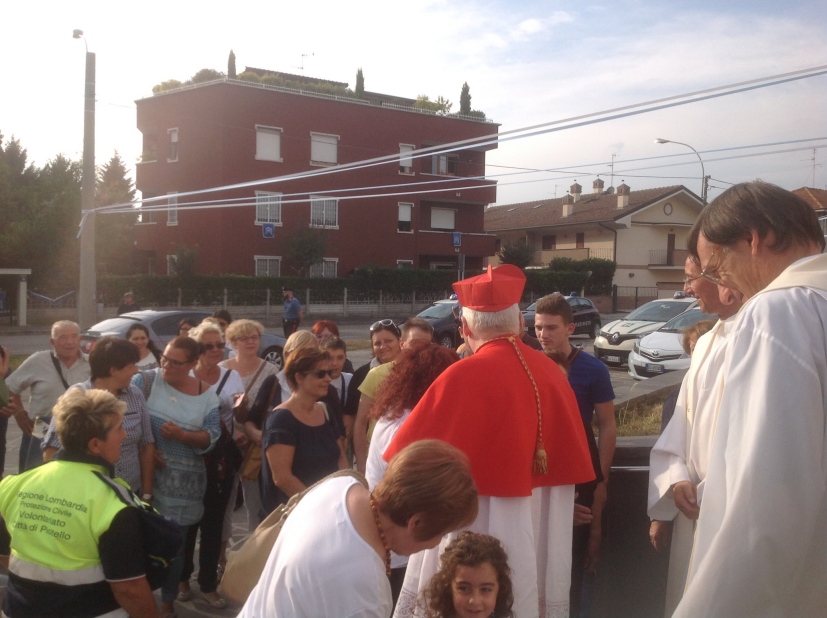 Fu costituita cinquant’anni fa come parrocchia di Seggiano che, allora, era il Santuario dedicato alla Beata Vergine Assunta, mentre dal 18 marzo 2011, è l’omonima chiesa moderna dalle belle e luminose architetture. E, allora, per festeggiare con tutta la Comunità, il 50esimo e l’avvicendamento del parroco – il 18 settembre a don Zaccaria Bonalumi succede don Andrea Andreis – arriva il cardinale Scola. I fedeli, le autorità con il sindaco di Pioltello, di cui Seggiano è ormai un quartiere senza soluzione di continuità, il coro, i tanti chierichetti e le famiglie, gli si stringono intorno già sul sagrato, prima della Messa concelebrata dal vicario episcopale di Zona, monsignor Cresseri, dal decano del Decanato Cernusco sul Naviglio, don Claudio Silva, da tutti i preti di Pioltello e, naturalmente, dal parroco uscente e da quello entrante.