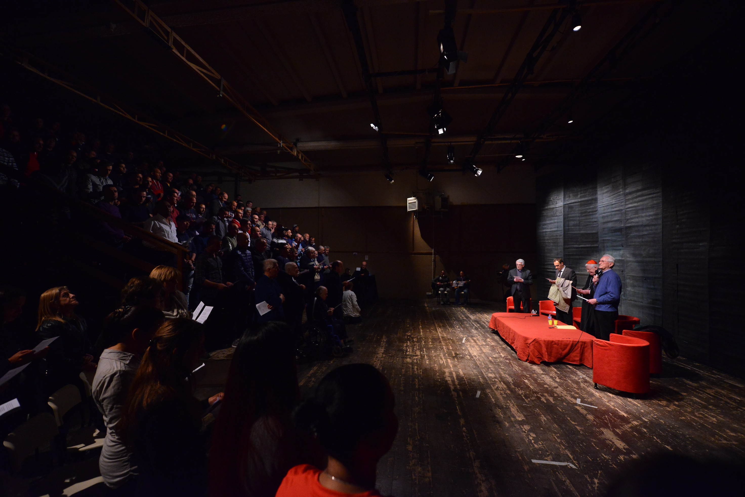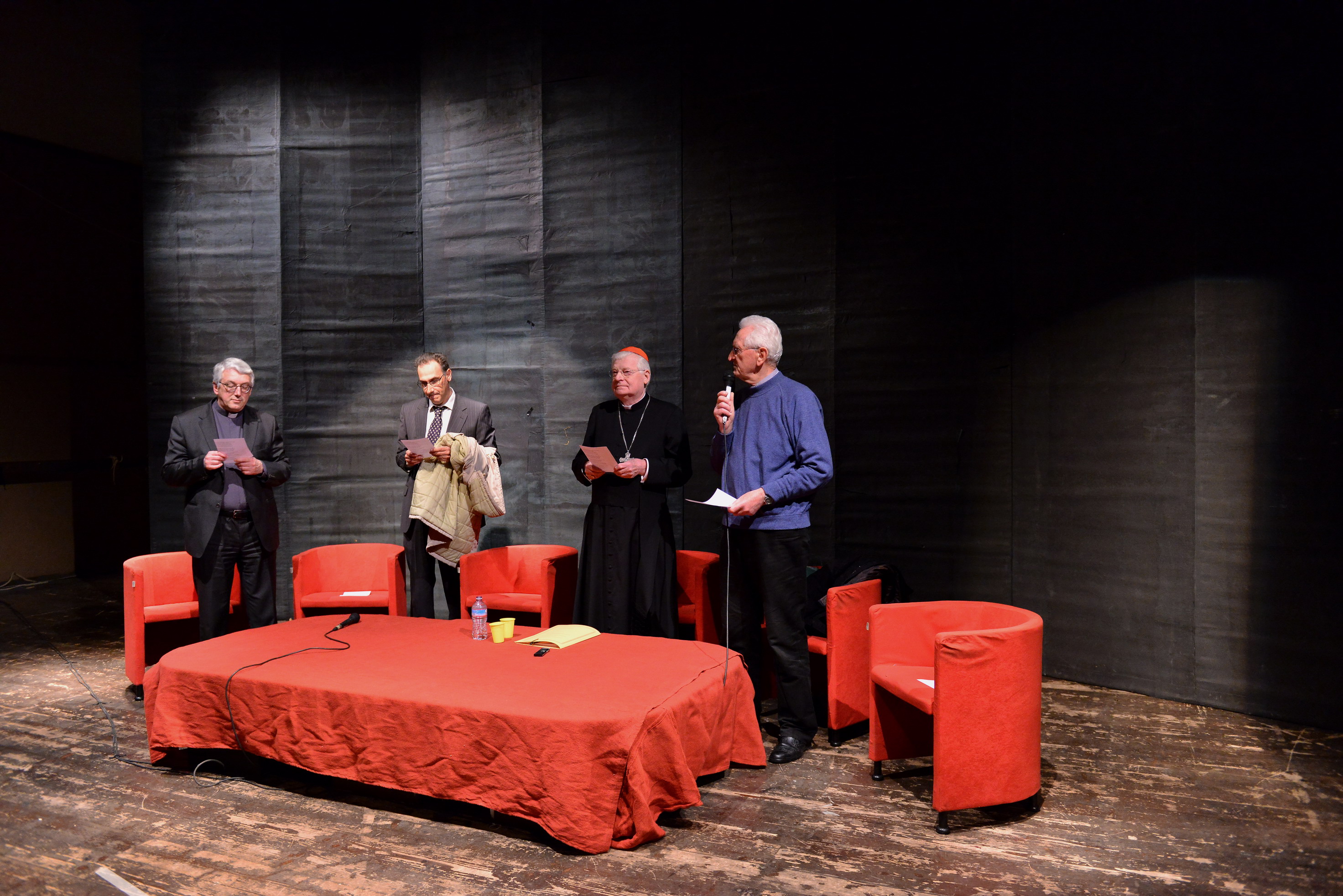Nel teatro della struttura, ad ascoltare l’Arcivescovo ,ci sono circa 150 reclusi, anche molte donne, in rappresentanza dei 1200 ospiti del carcere, 110 al reparto femminile, tra cui tre mamme con bimbi piccoli. Il canto “Madonna Nera” apre lo scambio tra domande – anche molto stringenti, elaborate dai reclusi del I Reparto – e le risposte del Vescovo. Accanto a lui, accompagnato dal vicario episcopale per l’Azione Sociale, monsignor Luca Bressan, i due cappellani, don Antonio Sfondrini e don Fabio Fossati e il direttore di “Bollate”, Massimo Parisi.