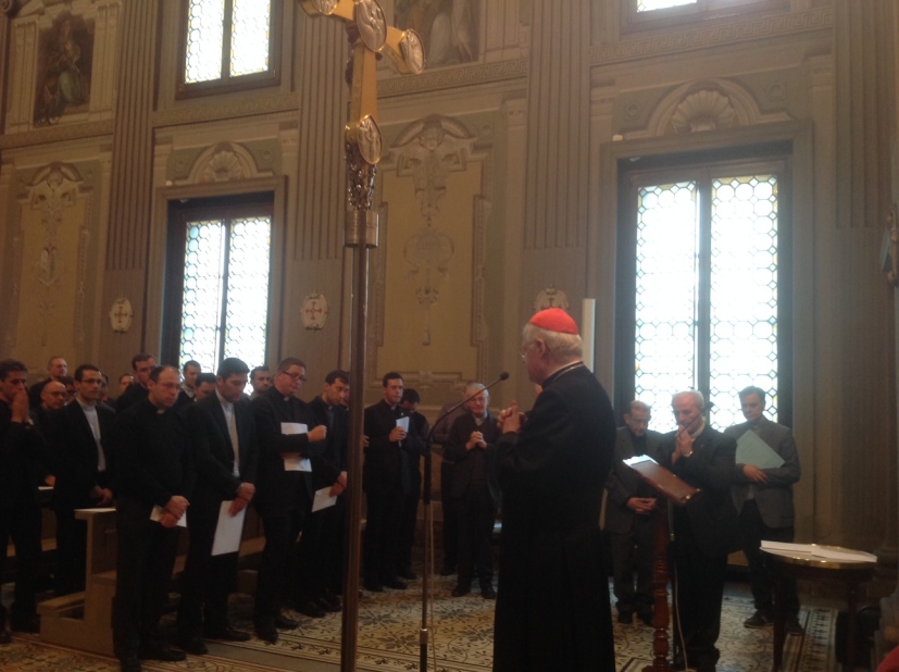 Nella «profonda continuità tra l’Eucaristia dell’Ordinazione e questo momento, in cui ciò che abbiamo celebrato nel Sacramento prende corpo» – per usare le parole del rettore del Seminario, monsignor Michele Di Tolve -, ha luogo nella Cappella arcivescovile della Curia la preghiera dell’Ora Media presieduta dal cardinale Scola, durante la quale vengono ufficialmente comunicate le destinazioni dei neo ammessi al Diaconato. Ossia le parrocchie e le Comunità pastorali in cui i 26 diaconi (venticinque ambrosiani e uno appartenente all’Arcidiocesi di Catanzaro-Squillace, che tuttavia resterà nella Chiesa di Milano), divenuti tali sabato scorso in Duomo, saranno inviati.