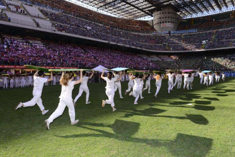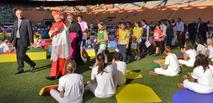 Una condivisione che si fa molto concreta nel gesto della raccolta fondi, realizzata al termine dell’incontro e destinata alla costruzione di un centro di formazione per l’allevamento e l’agricoltura di una parrocchia nella diocesi camerunese di Mbalmayo. Una condivisone che è anche nel gesto che l’Arcivescovo domanda a ciascuno di compiere annunciando che dal 16 al 20 giugno sarà in Iraq, a Erbil, per portare la solidarietà, l’amicizia, l’affetto e il conforto a tutti gli sfollati che sono stati oggetto di una prova durissima –, decine e decine di migliaia hanno dovuto lasciare le case, taluni sono morti –, e per sostenere i ragazzi «della vostra età che non riescono a istruirsi in maniera adeguata. Voglio portare loro la vostra solidarietà e amore cristiano, perché voi siete pieni di Spirito. Vi chiedo, di dire prima di dormire, tutte le sere un’Ave Maria per questi nostri fratelli e per tutti gli uomini e donne che sono perseguitati per il loro credo o il loro senso della vita». Poi, sulle note dell’Inno alla Gioia di Beethoven, il giro del campo che è un trionfo e ancora il richiamo all’ “insieme”.