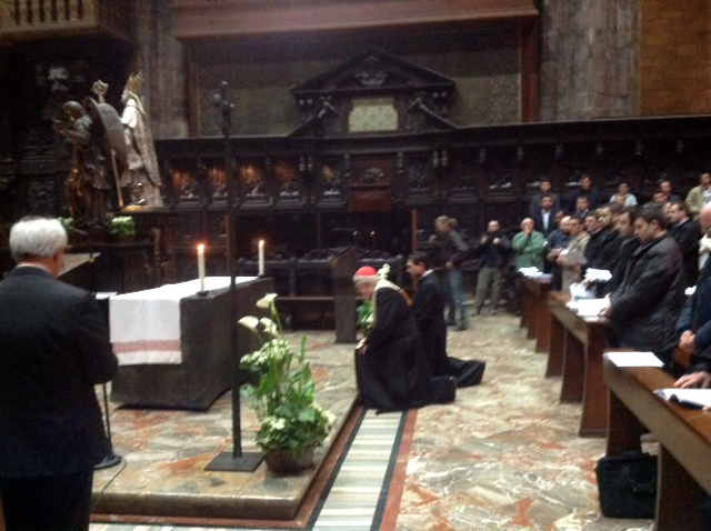 «Non c’è compito nella Chiesa che non sia un mandato. Questo è qualcosa che deve entrare nel nostro cuore e nelle nostre menti, nella nostra energia e azione, perché non si può esercitare, in nessun modo, il Ministero ordinato se non nella consapevolezza dell’essere mandati». Lo dice il cardinale Scola che, nella Cappella feriale del Duomo, venerdì 17 aprile recita l’Ora Media con i quasi 300 seminaristi riuniti nel Seminario di Venegono per la 59esima edizione del Convegno missionario nazionale seminaristi, promosso da “Missio consacrati”, una delle quattro realtà facenti parte della Pontificia Unione missionaria. Tra loro i 150 giovani ambrosiani, arrivati dal Seminario di Venegono dove si svolge la Tre giorni del Convegno, con il rettore, don Michele Di Tolve, il protettore don Luigi Panighetti, e i due vicerettori, del Quadriennio teologico, don Davide Milanesi e del Biennio, don Luca Corbetta.