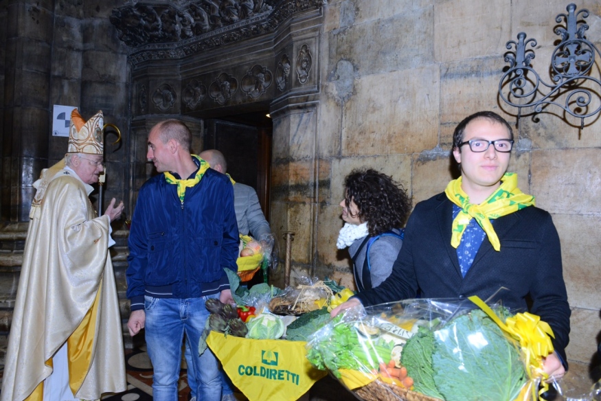 Nella festa liturgica di Nostro Signore Gesù Cristo Re dell’Universo, ultima domenica dell’Anno liturgico ambrosiano, il cardinale Scola presiede in Duomo la Celebrazione eucaristica cui partecipano un gran numero di associati alla Coldiretti della Lombardia, con il presidente della Federazione provinciale di Milano, Lodi e Monza Brianza, Alessandro Rota. Concelebra il consigliere ecclesiastico provinciale don Walter Magnoni. Dal Messaggio della Commissione CEI per i Problemi sociali e il Lavoro, la Giustizia e la Pace in occasione della 66ª Giornata nazionale del Ringraziamento, si avvia la riflessione dell’Arcivescovo: «Nella fertilità della terra, che ci dà di che vivere, lo sguardo credente scorge una espressione forte dell’affezione forte di Dio per le sue creature, dice il Messaggio per la Giornata che voi avete voluto significativamente inserire nell’Anno straordinario della Misericordia. È questo un segno di speranza per la Chiesa e anche per la società intera. L’attaccamento alla terra, ai suoi frutti, al lavoro genuino e ben fatto è un bene per tutte le donne e gli uomini di Lombardia che giustamente voi difendete dalla velenosa pratica della contraffazione».