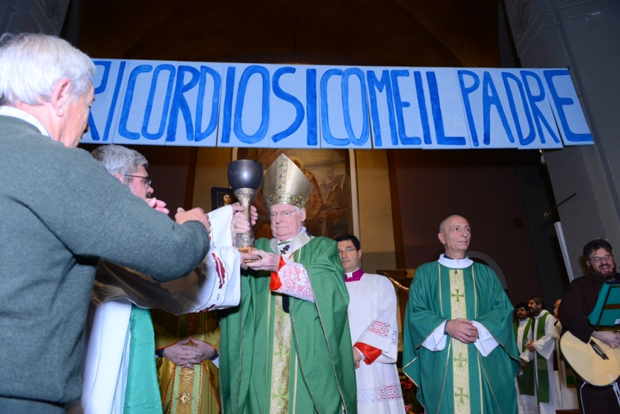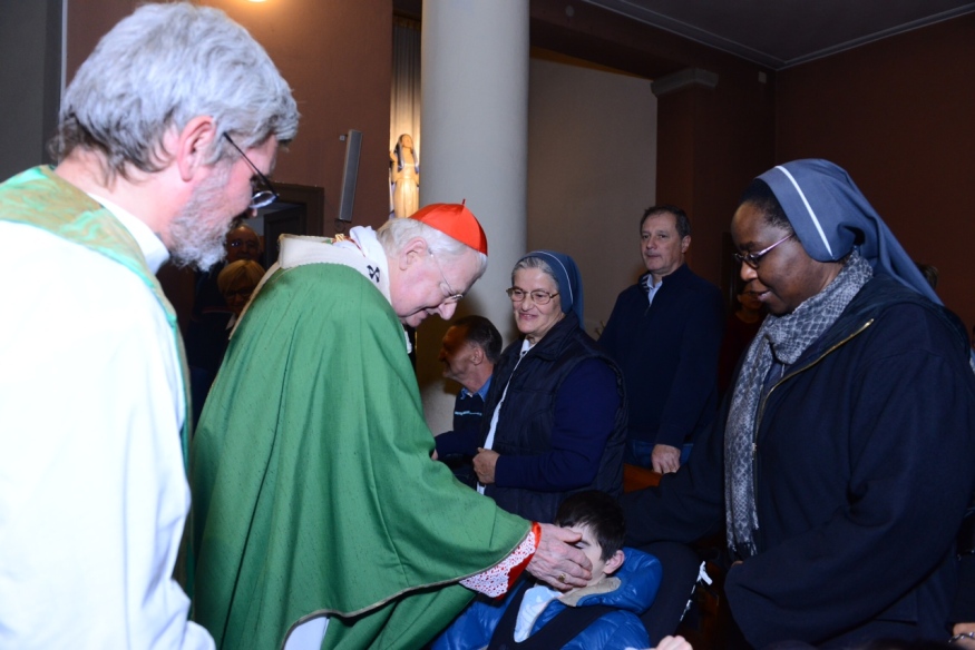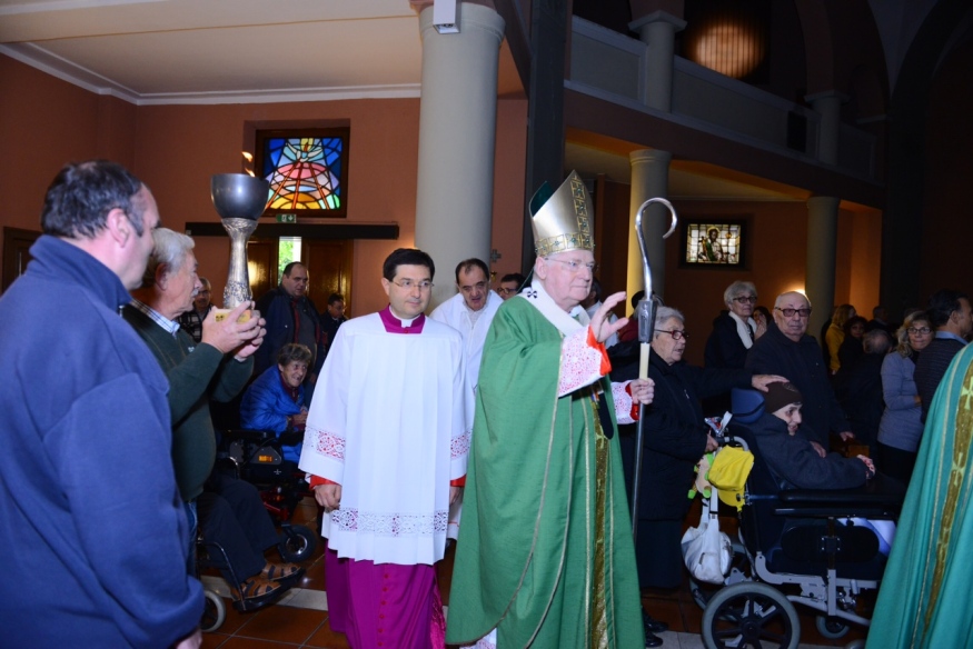 «Questa Eucaristia è un grande dono, perché si vede che credete veramente in Gesù», spiega il Cardinale, rivolgendosi direttamente ai presenti, specie gli ammalati. «Vi ringrazio in profondità e vi abbraccio a uno a uno, per corrispondere alla vostra accoglienza così calorosa e delicata». Il pensiero è per i parenti, i molti volontari (ogni week end donano un poco del loro tempo libero un nutrito gruppo di universitari, ma ci sono anche donne e uomini di tutte le età che collaborano), «e a quanti assumono l’elemento di prova, che attraversa la figura e il volto dei nostri carissimi ospiti, come una grande occasione di scoperta del primato di Dio nella vita e del fatto che il Signore non ci abbandona mai. Siamo, certi che ci accoglierà nella sua casa piena di porte aperte».