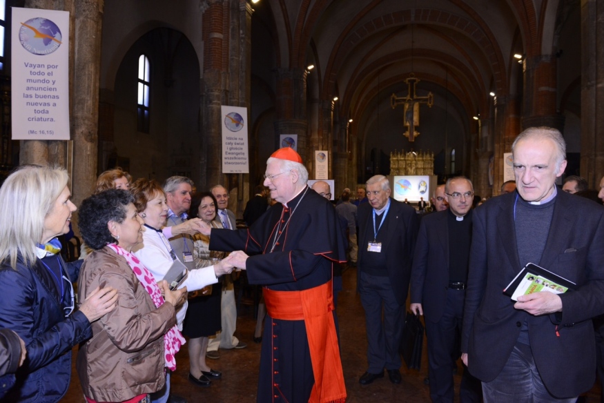 Un saluto «con cordialità e gratitudine per lo stile missionario che in tante chiese, non solo italiane», esprimono le Cellule Parrocchiali di Evangelizzazione. Questi sono i sentimenti a cui dà voce il cardinale Scola che, nella parrocchia di Sant’Eustorgio, arriva per il Assise che, in questo Anno straordinario dedicato alla Misericordia, approfondisce i temi indicati da papa Francesco, con la presenza e il confronto di molti aderenti. Qualcuno, come la delegazione pakistana, pur attesa per la prima volta, non è a Milano, perché è stata bloccata nel Paese di origine e sostanzialmente impedita a partecipare. Accanto all’Arcivescovo ci sono il fondatore e presidente dell’Organismo Internazionale di Servizio per le Cellule Parrocchiali, don Pigi Perini, il vicepresidente don Paolo Fenech, maltese, il cardinale Paolo Romeo, arcivescovo emerito di Palermo – che presiede l’Eucaristia in serata –, il teologo dell’Organismo stesso, abbé Mario St-Pierre, il parroco don Giorgio Riva e alcuni laici appartenenti al Comitato esecutivo. Tutti, già dal giorno precedente, impegnati nei Lavori che hanno visto anche la predicazione di mons. Pietro Fragnelli, vescovo di Trapani dal 2013. Nell’aprile 2015 l’Organismo Internazionale di Servizio per le C. P. E. ha ricevuto il Riconoscimento definitivo dal Pontificio Consiglio per i Laici e ha suggellato questa importante tappa del suo lungo percorso, con l’incontro con papa Francesco del settembre 2015 nella sala Paolo VI, cui hanno partecipato circa 5000 “cellulini”, provenienti da tutti i continenti.