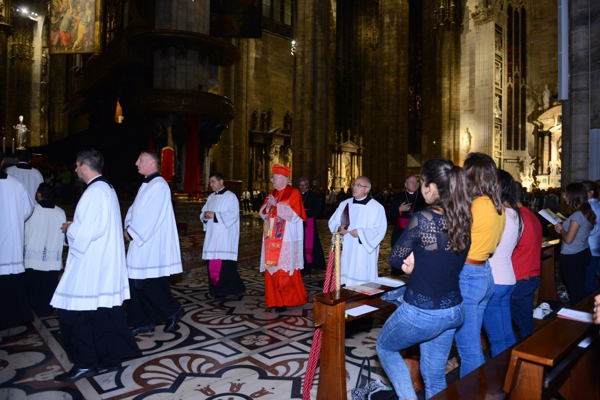 La direzione, esorta ancora l’Arcivescovo, è «essere capaci di quel distacco da sé che fa accettare ogni giorno il rischio della libertà, il rischio di cercare il proprio destino pieno, il tesoro nel cielo», come quello cercato dal giovane ricco. «Come ami? Come studi, come lavori, come condividi il bisogno, come sei misericordioso?». E ancora: «Che posto ha Gesù nella tua vita?», rilancia Scola. Perché, chiarisce, «noi non stiamo insieme solo perché facciamo cose belle, se non apparteniamo a Gesù». Ed è questa appartenenza, assicura il Cardinale, che consente di evitare la tristezza, quella del giovane del Vangelo che se ne va perché aveva molti beni. Perché – Scola lo ricorda da subito ai giovani, molti qui in Duomo con il proprio ragazzo o ragazza – «il suo sguardo d’amore è molto di più che quello che si ritrova nel proprio innamorato, che il bambino torva nella propria mamma».