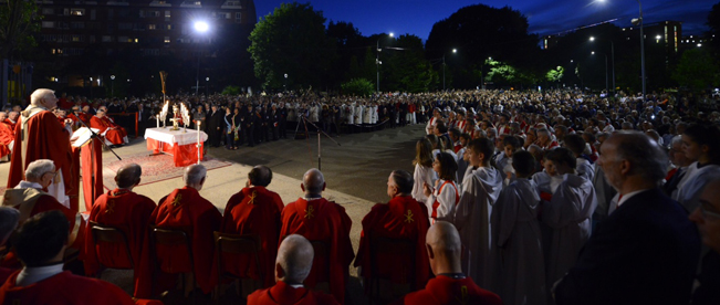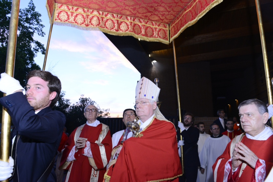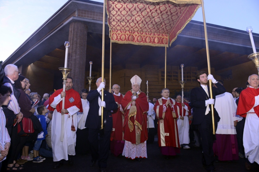 Il cardinale Scola che presiede l’Eucaristia in Santa Bernadetta, guida la processione, portando tra le mani l’Eucaristia nel prezioso ostensorio ambrosiano. Concelebrano i Vescovi ausiliari – cui si aggiunge il vescovo emerito di Pavia, monsignor Giudici –  tutti i Vicari episcopali di Zona e di Settore, i Canonici del Capitolo metropolitano della Cattedrale, con l’Arciprete. Ci sono i Diaconi permanenti, i Ministri straordinari dell’Eucaristia, i religiosi, le suore, i membri dei Consigli Pastorali, delle Confraternite e degli Ordini cavallereschi. Non mancano, come tradizione, i Gonfaloni del Comune, rappresentato dalla vicesindaco Balzani, della Città metropolitana con la consigliera Scavezzo, della Regione, di Associazioni religiose e civili e delle  Articolazioni ecclesiali.