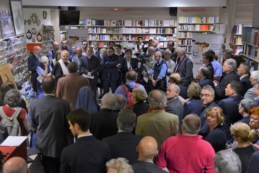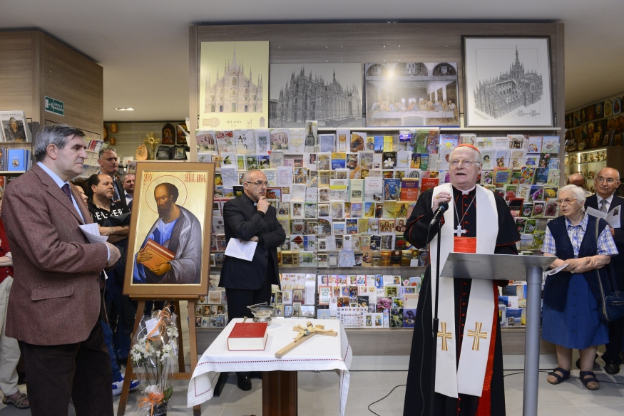 L’assessore alla cultura Filippo Del Corno, porta il saluto a nome del sindaco Pisapia e suo personale, «con la gioia che si ha sempre quando apre uno spazio di cultura e di dialogo». Gli fa eco, in una breve riflessione, Giuliano Vigini, docente di Sociologia dell’Editoria contemporanea in “Cattolica” e grande esperto del settore cattolico: «La libreria è luogo non solo di vendita, ma di comunicazione, spazio destinato ai tanti gusti di cibi che servono a nutrire lo spirito: è un pastello che edifica il nuovo umanesimo di cui ci parla il cardinale Scola». Il quale, nella sua esortazione, prima della benedizione, sottoliea: «Siamo tutti molto lieti di questo gesto che vuole continuare lo sforzo della Società San Paolo, ormai prolungato nel campo dell’editoria a tutti i livelli. D’altra parte, come dice Evangelii Nuntiandi, la Chiesa si sentirebbe colpevole, di fronte al suo Signore, se non adoperasse questi potenti mezzi: Mezzi come strumenti di annuncio, Catechesi, come riferimento delle domande che suscita il paragone l’annuncio e la realtà, e il tentativo di un approfondimento organico e sistematico della vita cristiana che la teololgia e le scienze che si connettono possono assicurare».