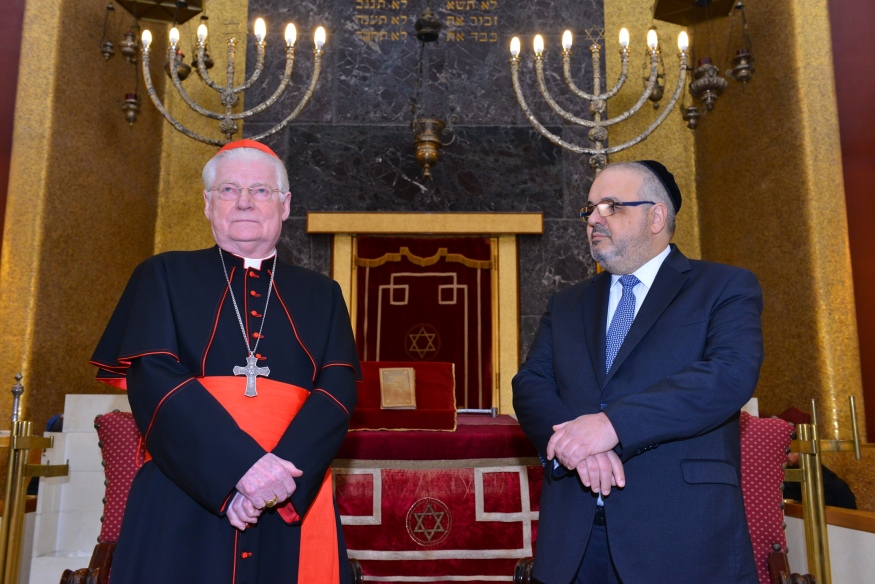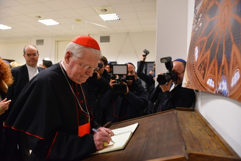 Nella sinagoga centrale di Milano, rivolta come tutte verso Gerusalemme, entrano insieme il Rabbino capo, rav Alfonso Arbib e l’Arcivescovo di Milano, il cardinale Scola che ha voluto fortemente la visita allo storico Tempio, in cui fa il suo ingresso per la prima volta come guida della Chiesa ambrosiana. Dopo aver visitato una mostra a pannelli dedicata ai luoghi e agli oggetti di culto dell’ebraismo italiano, nella Sinagoga gremita, l’accoglienza è subito calorosissima, mentre il Cardinale e il Rabbino prendono posto sotto i due grandi Candelabri a sette braccia. Ci sono fedeli ebrei e cristiani: della Delegazione della Diocesi fanno parte alcuni Vescovi ausiliari, rappresentanti del Consiglio delle Chiese Cristiane di Milano con l’attuale presidente, il pastore Platone, sacerdoti e partecipanti alla Commissione per l’Ecumenismo e il Dialogo della Diocesi, membri del Comitato scientifico dei “Dialoghi di Vita Buona”. Ad ascoltare ci sono l’intera dirigenza della Comunità ebraica di Milano, la seconda più numerosa in Italia, Yahya Pallavicini, presidente del Coreis (Comunità Religiosa Islamica Italiana), molte autorità civili e militari tra cui il Prefetto facente funzione, il generale di Corpo d’armata Amato dei Carabinieri, i direttori del Corriere e di Avvenire, Fontana e Tarquinio.