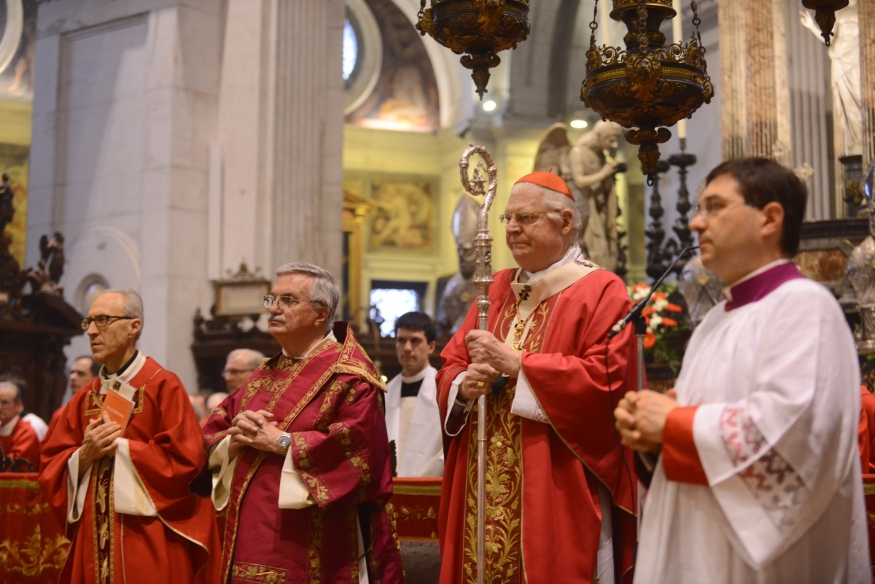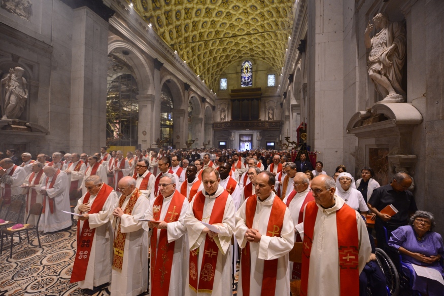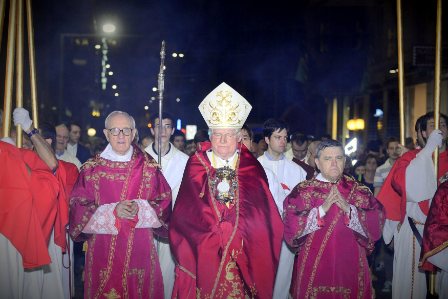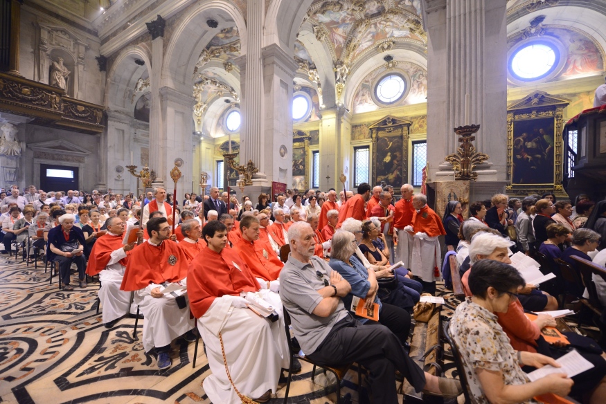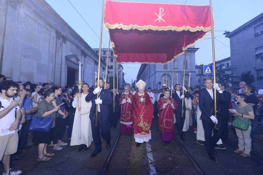 A pregare col Santissimo sorretto dal Cardinale, nel prezioso ostensorio ambrosiano, ci sono i Vescovi ausiliari, il Capitolo metropolitano, gli Ordini cavallereschi, le Confraternite, centinaia di sacerdoti, i seminaristi, i rappresentanti delle massime autorità civili locali con i Gonfaloni e gli aderenti ad associazioni, movimenti, articolazioni ecclesiali. Non mancano le Cappellanie e le Comunità straniere – specificamente inviate e che animano con canti in diverse lingue la liturgia –, il mondo del volontariato e delle università. Un intero popolo, di ogni età e condizione, che disegna la Milano di domani, entra così in Duomo, sotto il bel cielo della sera che scende, e ascolta in silenzio la riflessione dell’Arcivescovo su quel Pane che «nutre per sempre».