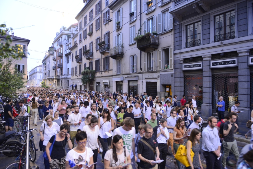 Al passaggio le vie del centro si fermano, la gente esce dai tanti locali aperti, qualcuno guarda con curiosità, molti si inginocchiano. Il cammino percorre un itinerario tradizionale e storico delle grandi processioni della Chiesa di Milano: dopo la Messa nel Santuario mariano di Santa Maria dei Miracoli presso San Celso – gremita fino al sagrato e a corso Italia – si arriva in Duomo, accompagnati dai canti, dalla Parola di Dio, dalle tre Letture magisteriali (due tratte dal volume dell’Arcivescovo Cosa nutre la vita? e una da un recente Angelus del Papa). Tutto per dire, col titolo di quest’anno – “Non di solo pane”, in evidente riferimento a Expo -, il tema dell’Eucaristia, declinato in tre tappe: “Un pane che rende presente Dio”, “Un cibo da condividere”, “Un cibo che educa”. Non a caso, l’icona artistica scelta per il Rito, l’Ultima cena del Tintoretto, è l’immagine della tela esposta nel Padiglione della Santa Sede.