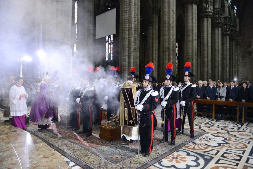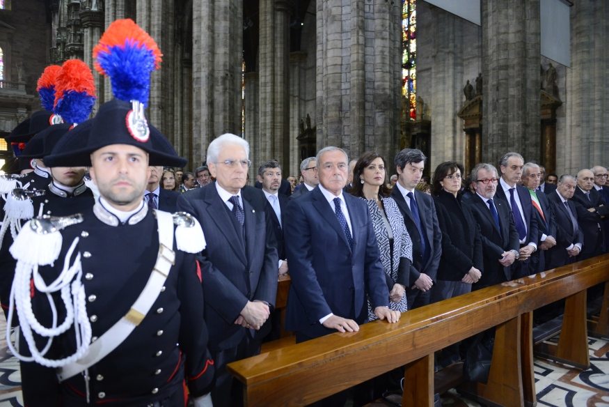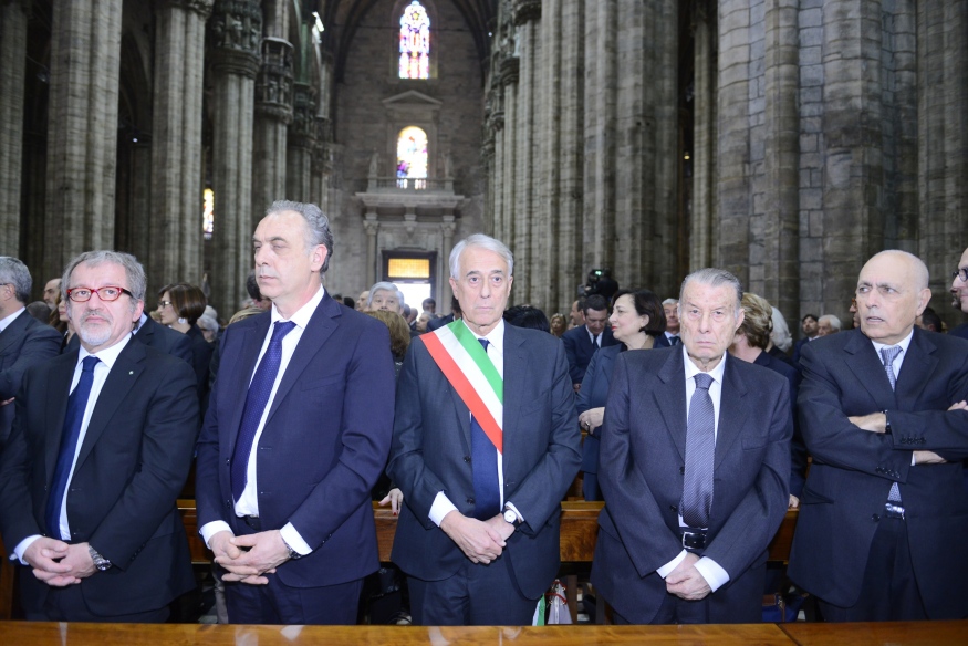 Sono i funerali di Stato e in prima fila siedono il presidente della Repubblica, Sergio Mattarella, il presidente del Senato, Piero Grasso – il primo ad arrivare -, quello della Camera, Laura Boldrini, il Guardasigili, Andrea Orlando, il sindaco Giuliano Pisapia e il presidente della Regione Roberto Maroni.