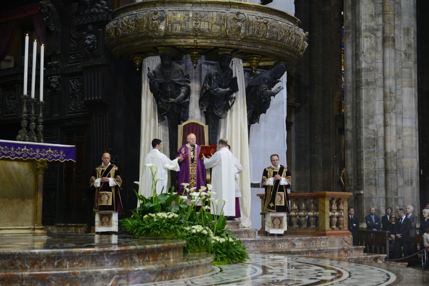 Concelebrano il rito esequiale, presieduto dal cardinale Scola, tutto il Capitolo metropolitano, i Vescovi ausiliari e il Consiglio episcopale. I Gonfaloni – anche quello del Milan chiesto espressamente dai familiari di Claris Appiani -, paiono abbracciare con la gente l’ultima presenza di queste due vite stroncate improvvisamente.