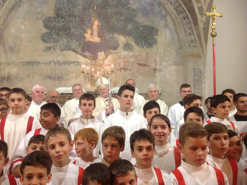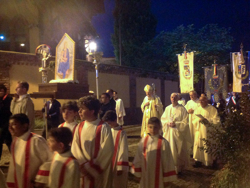Poi la lunga processione che dalla chiesa arriva nel vicino Santuario, attraversando le vie strette e antiche sotto il Castello, tra finestre addobbate di fiori, nastri bianco-azzurri e simboli mariani. L’Arcivescovo, i sacerdoti (che per l’occasione vestono casule personalizzate con l’immagine della Madonna dell’Albero) e la gente seguono un’icona dipinta ad hoc che richiama quella venerata. Si prega l’Ave Maria. Pochi riescono a entrare nella piccola cappella, dove il Cardinale ammira gli affreschi restaurati, di scuola del Bergognone e luinesca, e, soprattutto, l’immagine della Madonna con il Bambino, affrescata nel 1517 sulla parete dell’abside a ricordo dell’Apparizione della Vergine ad alcuni fanciulli. L’incensazione e la benedizione finale concludono la serata, mentre dall’interno del Santuario e all’aperto si alza il canto corale del Magnificat.