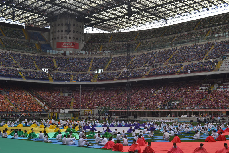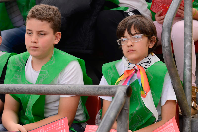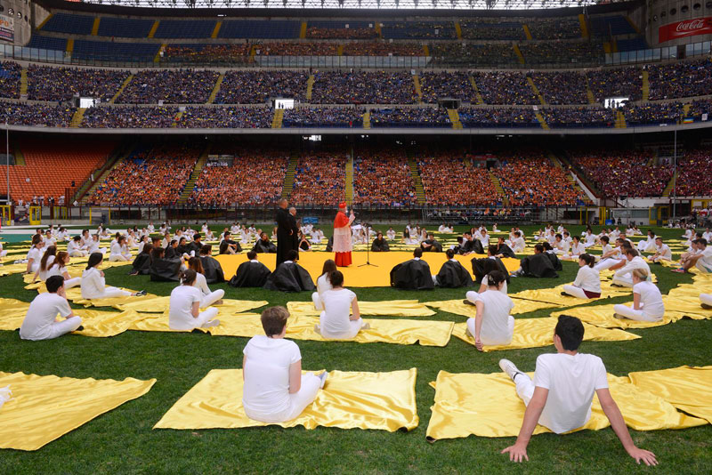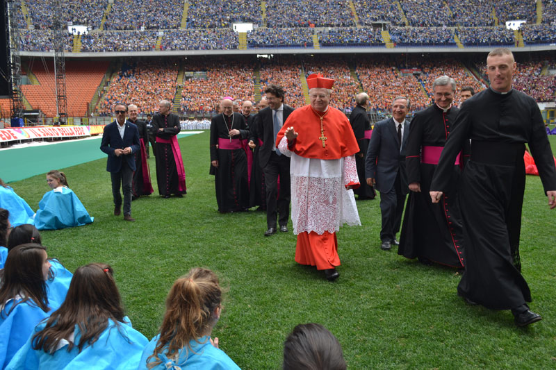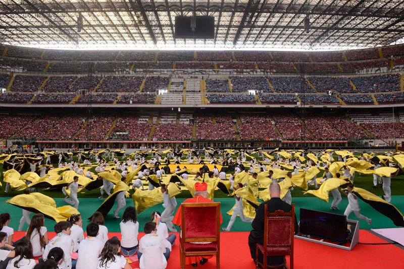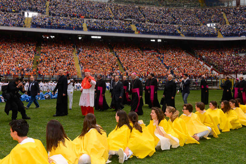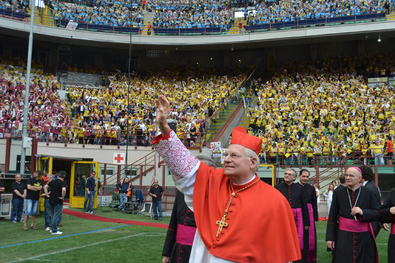 «Siamo in un posto straordinario, qui si giocano le più belle partite al mondo, ma il motivo per cui noi siamo qui, in questo luogo, è ancora più bello e importante di quelle partite: tu qui oggi ti giochi la partita più importante di tutte, ti giochi la partita della vita. Noi tutti dobbiamo vincerla questa partita attraverso la riuscita di noi stessi e quindi attraverso la felicità che ha come condizione la libertà». Queste parole, pronunciate dal cardinale Angelo Scola, durante la sua omelia oggi pomeriggio allo stadio di San Siro, spiegano il vero significato della festa che ha visto radunarsi ben 50mila persone provenienti da tutte e sette le zone pastorali della Diocesi di Milano: oltre ai cresimandi, vi erano infatti i loro genitori, i padrini e le madrine, i catechisti e le catechiste che li hanno guidati nel cammino d’ingresso e crescita nella fede.
