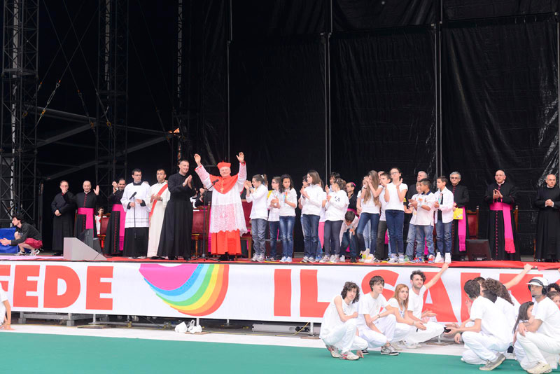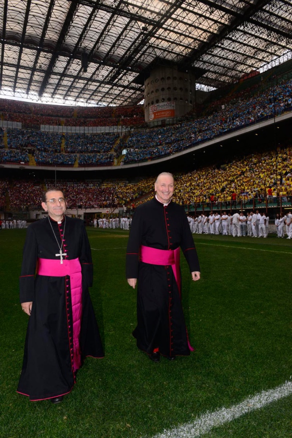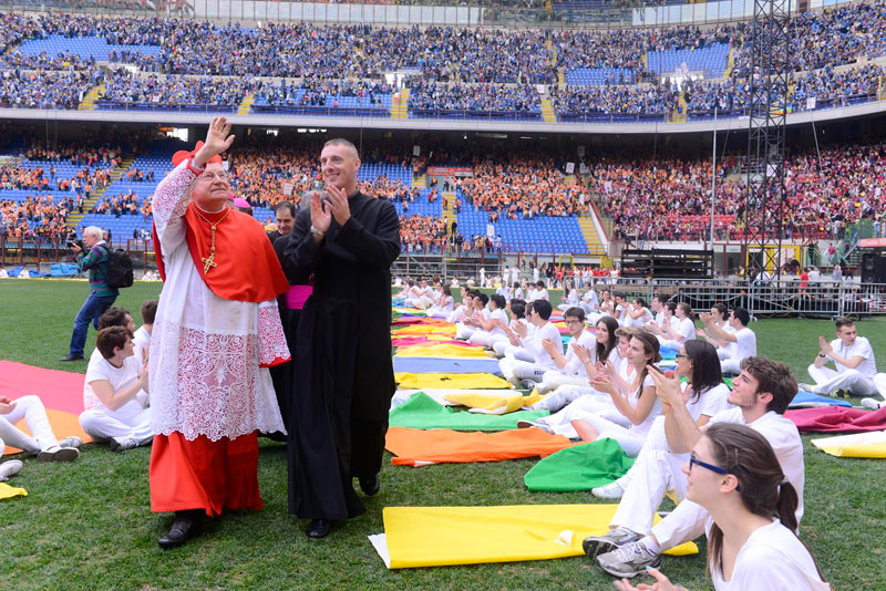 «Terminata questa fase, quella in cui avete ricevuto i grandi sacramenti, adesso il percorso della fede vi chiede di andare avanti, di non fermarti – ha continuato il cardinale Scola -. Così ha fatto Bartimeo. Guai se vi allontanate adesso, adesso viene il bello. Continuate a seguire e a creare uno stile di vita e comunicatelo a tutti. Le cose belle non bisogna tenerle dentro. Adesso che abbiamo fatto il salto della fede non cadiamo nella tristezza di tornare indietro. La vita è davanti a voi ed è come una partita, giocala tu in prima persona, ma giocala insieme agli altri. Il dono dello Spirito vi renderà uomini capaci di amare e di costruire. Questo è il senso della vita. Seguire Gesù vuol dire sapere dove si va, buon cammino ragazzi». L’arcivescovo Scola ha poi ricordato a tutti le parole che Papa Benedetto XVI ha pronunciato proprio allo stadio Meazza un anno fa e che indicano la meta verso cui il loro cammino deve vertere: «amici, la meta ce l’ha ricordata l’anno scorso Papa Benedetto XVI con queste parole: tendete ad alti ideali: tutti possono arrivare ad una alta misura, non solo alcuni! Siate santi!».