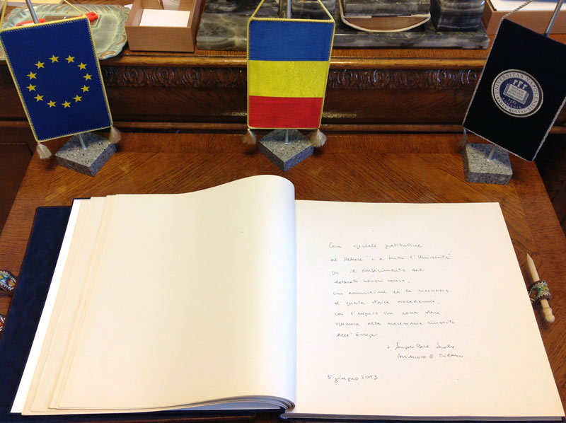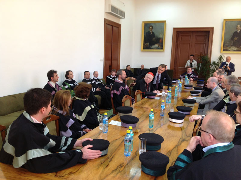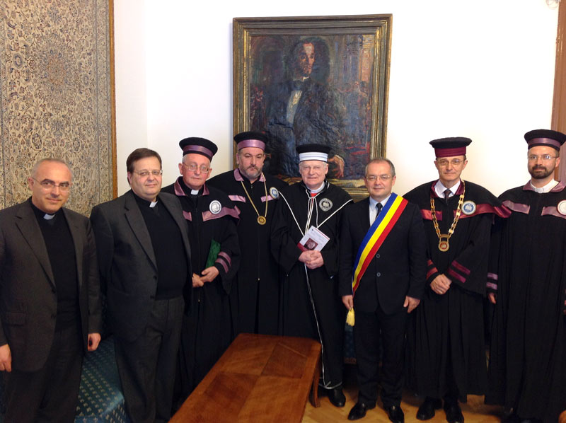 Prima del conferimento della laurea, invece, l’Arcivescovo ha avuto un incontro molto cordiale col professor Ioan-Aurel Pop, rettore magnifico dell’università, che gli ha presentato la grande realtà di questa prestigiosa istituzione. Fondata dai Gesuiti nel 1581, l’università di Cluj (città di 400 mila abitanti, un quarto dei quali studia o insegna all’ateneo) è la più antica della Romania. È l’unica università europea che ha tre lingue ufficiali di studio (romeno, ungherese e tedesco). Attualmente conta 50 mila studenti, 21 Facoltà (tra cui quattro teologiche: ortodossa, cattolica romana, greco- cattolica e protestante) e centinaia di specializzazioni, dalla laurea breve agli studi post universitari. Sono duemila gli studenti provenienti dall’estero, anche dall’Italia: l’università ospita sette centri culturali stranieri, compreso quello italiano.