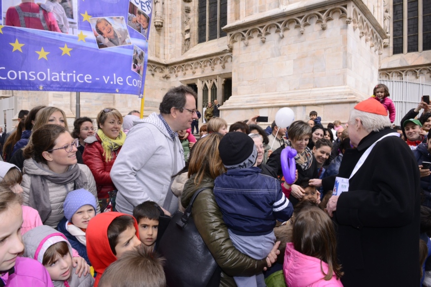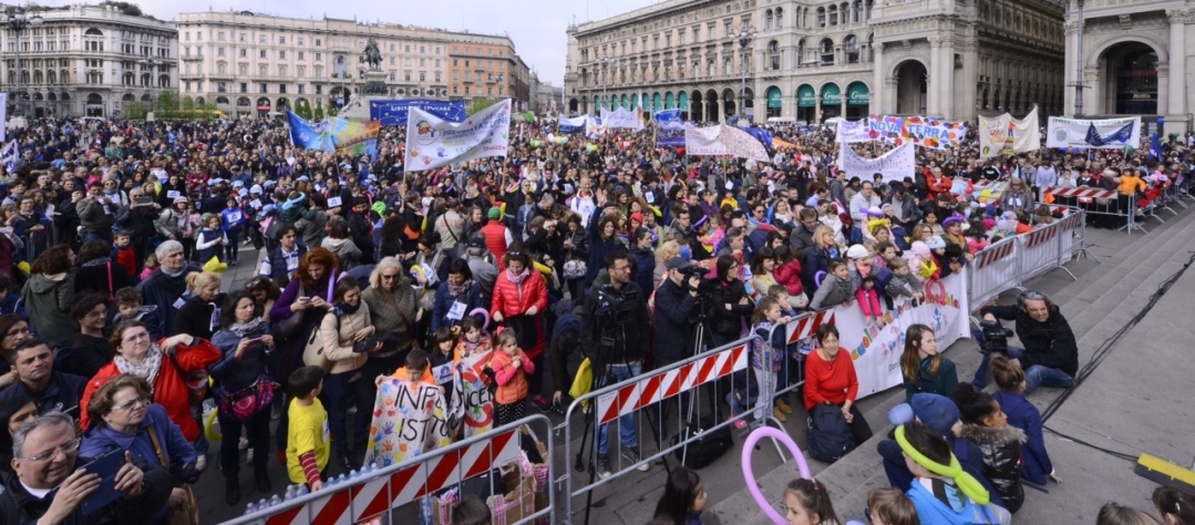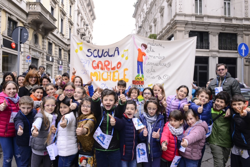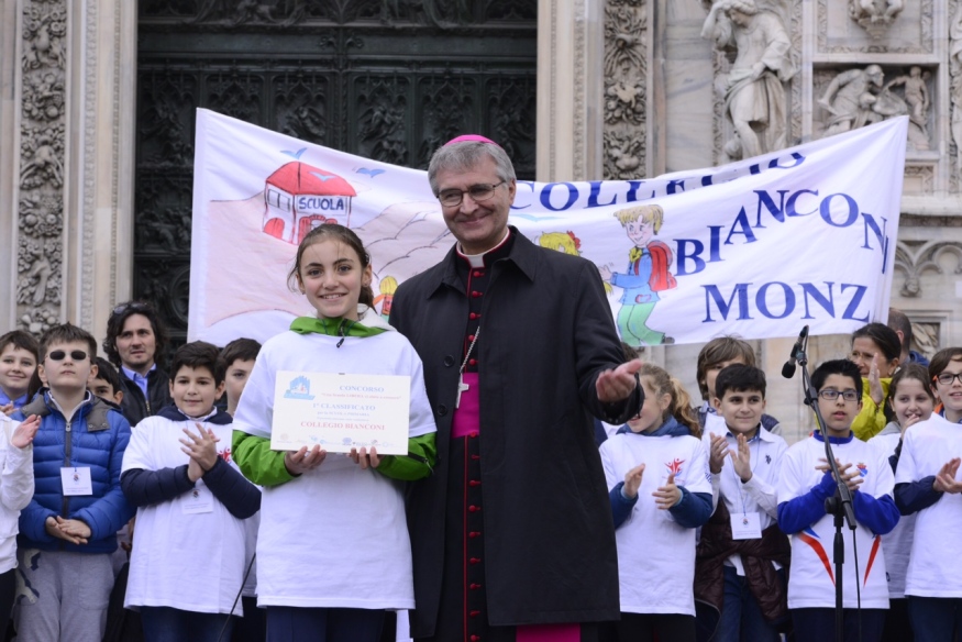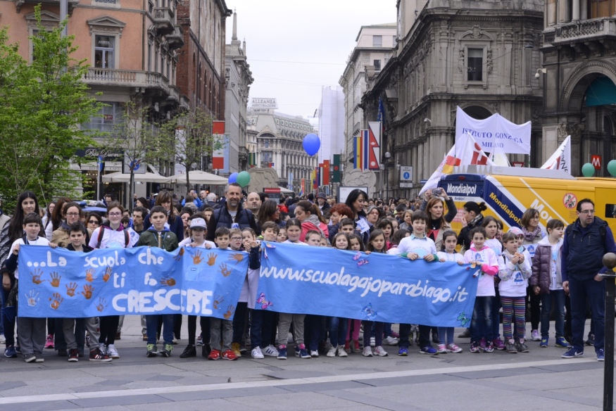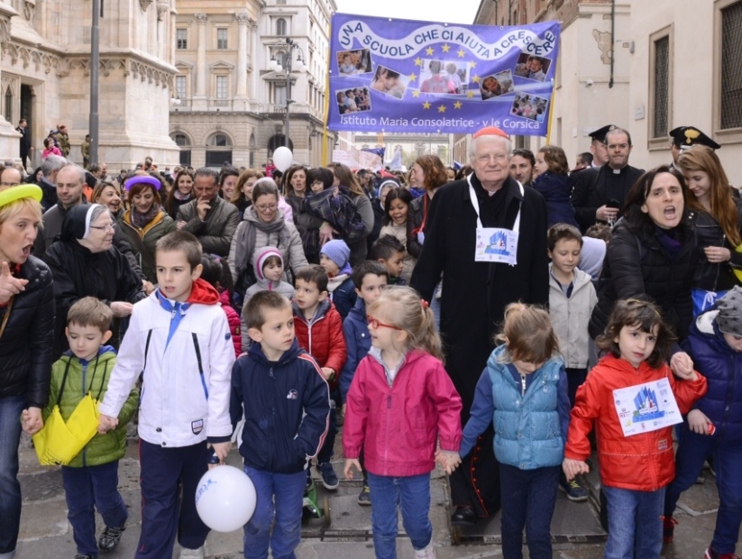 Dai piccoli, che partono da piazza Beccaria per la loro mini-marcia, ai più grandicelli e ai ragazzi dei Licei che prendono avvio da piazza della Stazione Centrale, è un lungo susseguirsi di striscioni colorati, di allegre voci e slogan, quello che va in scena per le vie del centro di Milano. Fino ad arrivare in piazza del Duomo, dove prendono la parola i rappresentanti delle Associazioni, delle scuole, gli assessori all’Istruzione e Formazione, Cappelli e Aprea che rappresentano il Comune di Milano e la Regione, il vicario Episcopale per la Pastorale Scolastica, monsignor Pierantonio Tremolada. Si premiano Istituti e si ricorda l’esempio virtuoso di Porlezza (all’estremo confine della Diocesi) che ha promosso una bella sinergia tra scuole statali, paritarie e parrocchie, coinvolgendo più di settecento alunni degli Istituti della zona, dalla materna ai Licei.