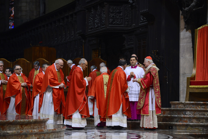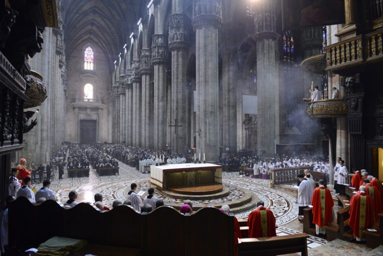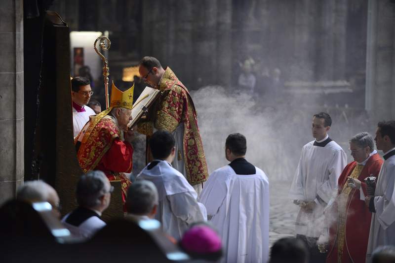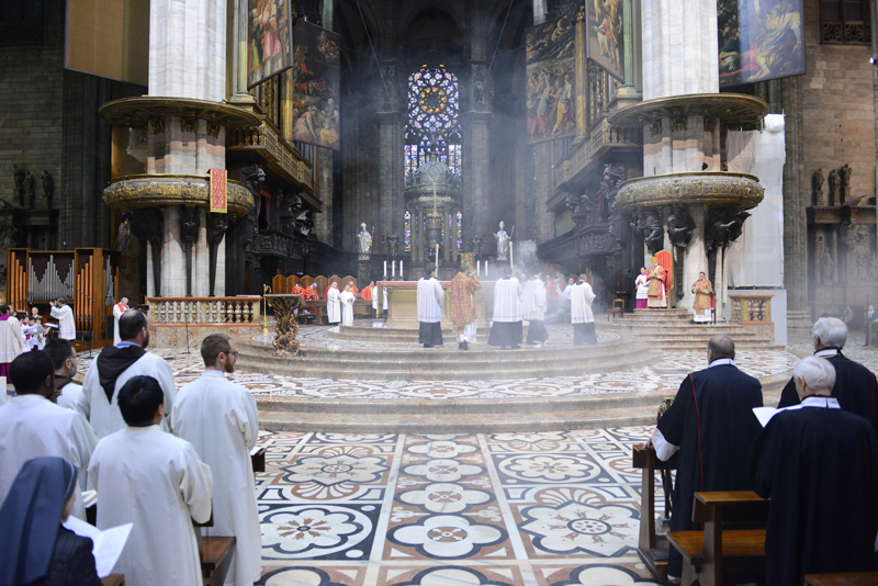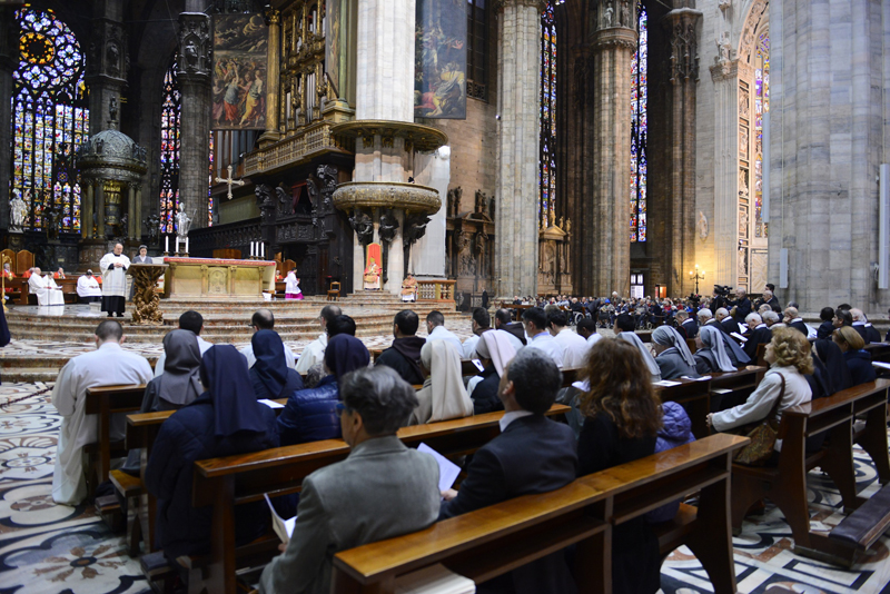 Tutto parla, all’inizio del Triduo Pasquale, del sacrificio dell’Innocente che, consegnandosi liberamente alla Croce per la salvezza di tutti, consegna a noi la responsabilità di un amore autentico da condividere con i fratelli. Un donarsi nel servizio del quale è simbolo la Lavanda dei Piedi, compiuta dall’Arcivescovo su dodici giovani italiani e di origine straniera, impegnati nei cammini di consacrazione alla vita religiosa: tre benedettini, un premonstratense, tre cappuccini, un appartenente alla comunità monastica ecumenica di Dumenza e quattro giovani del Pime. E ciò per sottolineare l’Anno dedicato da papa Francesco, appunto, alla Vita consacrata, evidenziato anche dall’animazione liturgica proposta da alcune religiose.