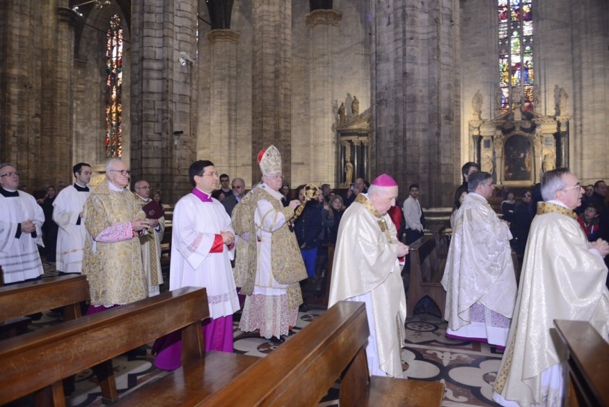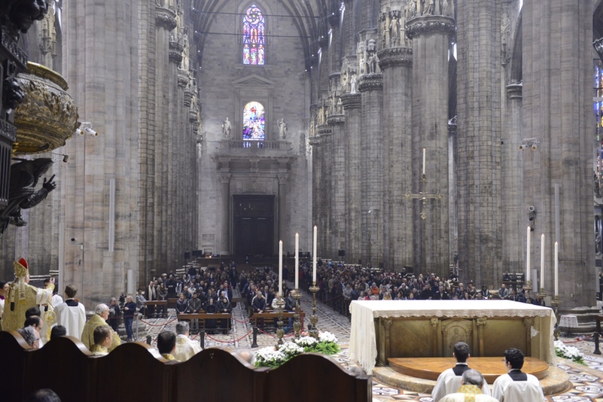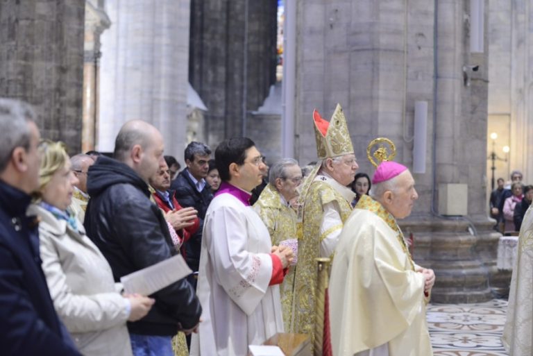“La festa che dà origine a tutte le feste”, come recita, nella nostra liturgia, il Prefazio del giorno di Pasqua, giorno, dunque – dice il Salmo 117 –, in cui rallegrarsi ed esultare. È il Pontificale solenne di Pasqua, presieduto dal cardinale Scola in una Cattedrale che pare ancora più bella nella mattina inondata di sole e dei colori che attraversano quelli delle vetrate. Immagine viva della festa di gioia intorno a Gesù risorto, «Colui che è entrato in un genere nuovo di esistenza».