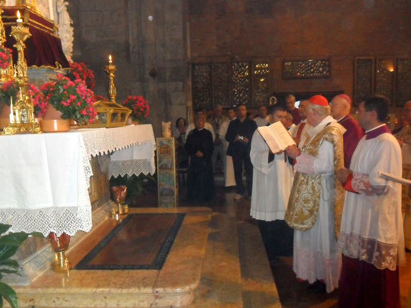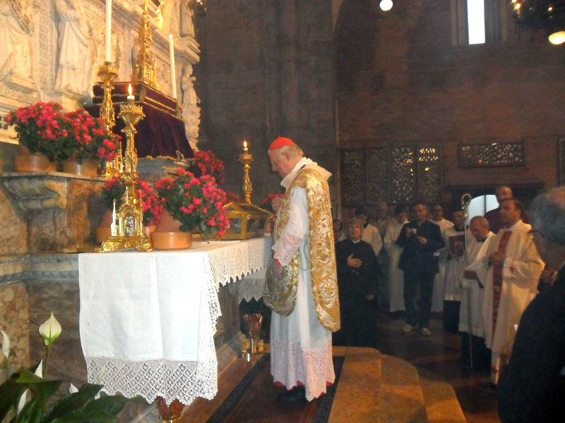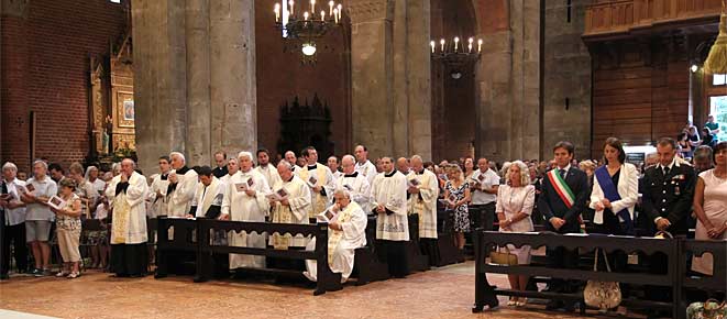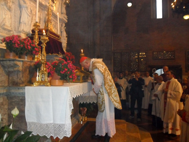 «È molto significativo che per accedere all’urna del Santo – ha affermato l’arcivescovo – la vostra tradizione richieda l’intervento simultaneo di quattro istituzioni che ne possiedono le chiavi: la provincia, il sindaco, la comunità agostiniana e il capitolo della cattedrale. Questo singolare atto comunitario ha una carica simbolica assai attuale. Dice la necessità della concordia. Esprime bene quel “concorso dei cuori” che nella Chiesa si chiama comunione e che nella società civile già Aristotele chiamava filìa, cioè amicizia civica, condizione essenziale per il buon governo. Pavia, nelle cui Università e collegi si sono formate tante nobili personalità, guardando con cuore rinnovato al “suo” grande Santo, sarà luce per tutta la società italiana, e non solo».