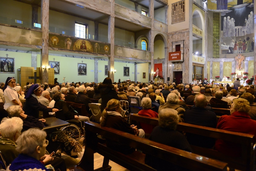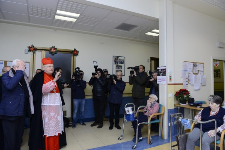 Ma l’atmosfera, all’interno della struttura che, anch’essa, ha saputo essere al passo dei tempi con impianti e reparti all’avanguardia, è calda tra tante decorazioni natalizie, i presepi, i pulitissimi e decorosi corridoi su cui si affacciano le camere dei degenti. Il cardinale Scola entra, per la quarta volta (ogni anno da quando è Arcivescovo di Milano) nella domenica che precede il Natale, appunto al “Palazzolo” e prima di tutto, saluta i pazienti. L’ampia chiesa dell’Istituto è gremita di ospiti, parenti, medici, personale, ci sono le Suore Poverelle fondate proprio dal beato Luigi Palazzolo e quelle della Carità, concelebrano monsignor Bazzari, presidente della Fondazione don Gnocchi (cui l’Istituto appartiene dal 1998), quattro dei sei sacerdoti qui ricoverati, il decano del Decanato “Cagnola” don Carlo Azzimonti, presenti il neo direttore della struttura, Roberto Costantini, i vertici della Fondazione, l’assessore Granelli in rappresentanza dell’Amministrazione comunale, le volontarie dell’Oftal che, due volte all’anno accompagnano i malati al Lourdes, gli Alpini, con il presidente della sezione di Milano, Luigi Boffi.