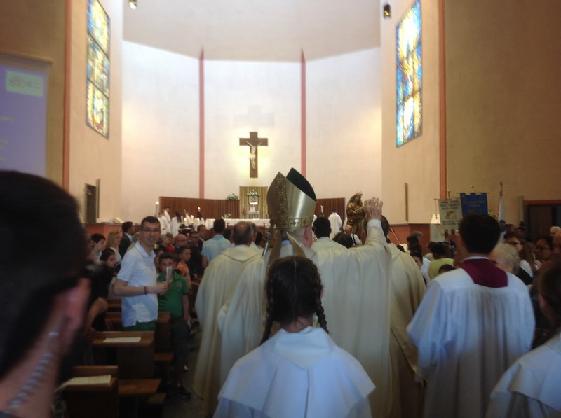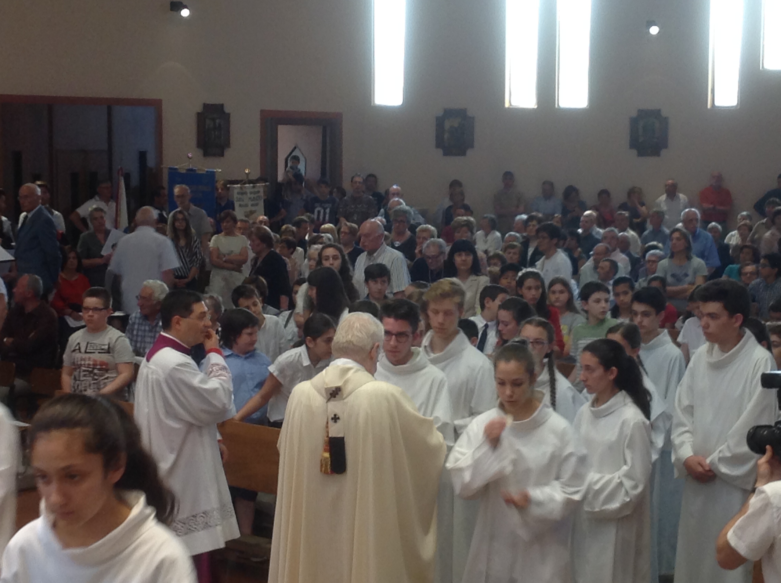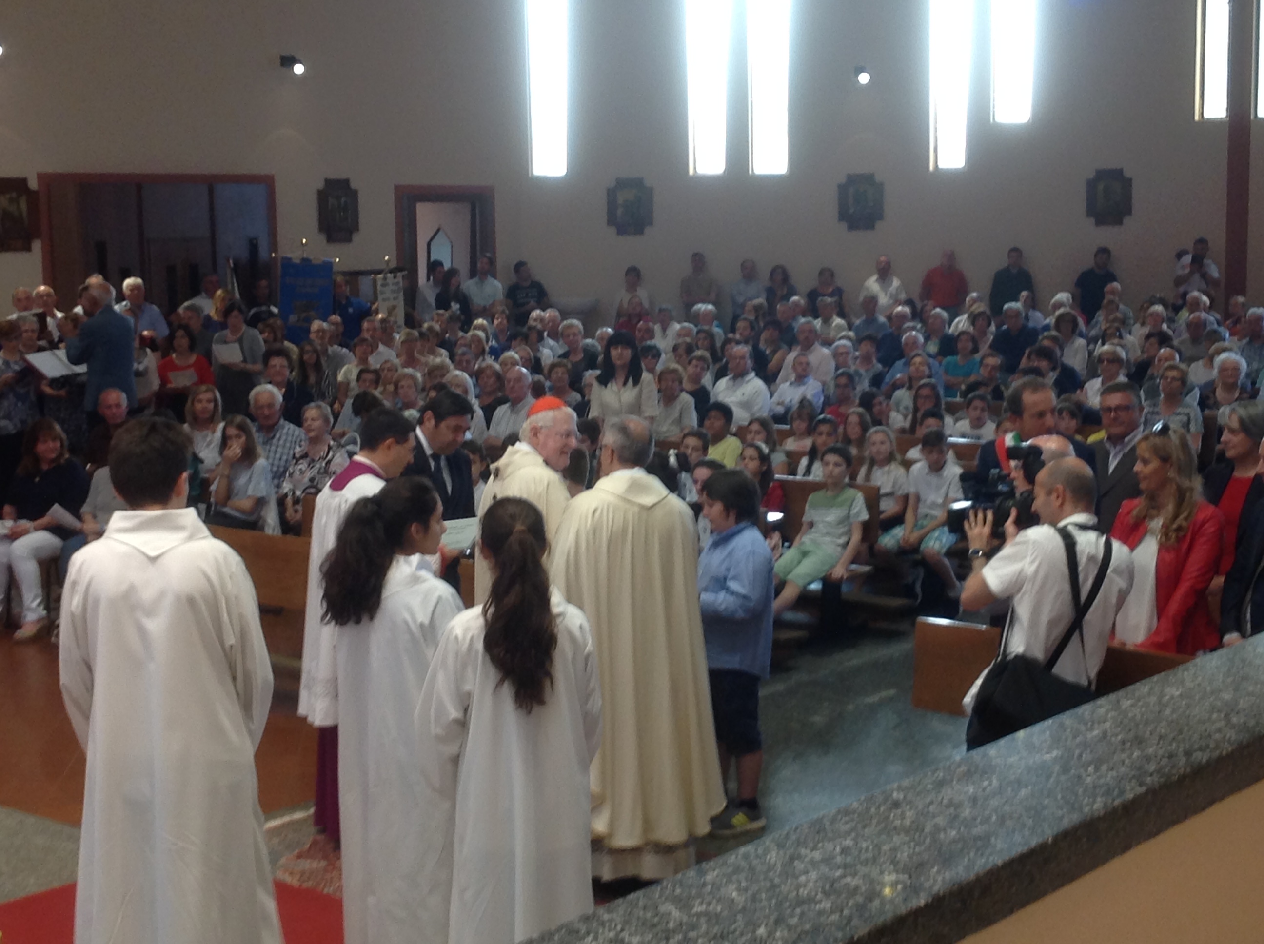 «Un caloroso saluto e un benvenuto» – per usare le parole del parroco, don Attilio Anzivino – accolgono, a Busto Arsizio, il cardinale Scola nella parrocchia “Santa Maria Regina” che festeggia i 50 anni di fondazione. La Comunità, nata da una costola di “San Michele” (molto sentita, qui, l’appartenenza) è oggi una realtà comunque “giovane” e particolarmente attiva. Come ben si evince dalla tanta gente che gremisce la chiesa già da prima della Celebrazione e dal nutrito gruppo di ragazzi della Cresima che saluta, sul sagrato, l’Arcivescovo. «Ricordatevi, ogni mattina, di fare il Segno della croce e, la sera, di dire un’Ave Maria», raccomanda loro Scola.
