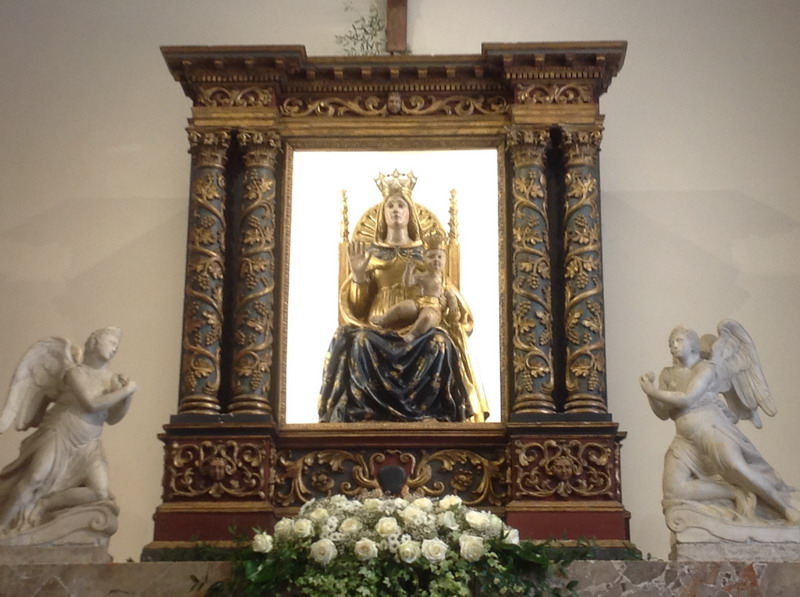 Effigie lignea che, in una copia identica all’originale, pare vegliare a lato dell’altare allestito nella piazza antistonte il Santuario in cui Cardinale arriva, tra centinaia e centinaia di fedeli, per festeggiare il 500 anni dell’amato luogo di culto.
