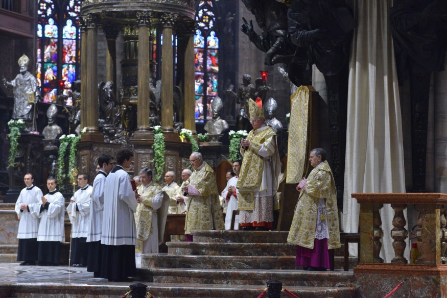 In una radiosa giornata di sole, con il Duomo che si staglia, magnifico, sullo sfondo di un cielo azzurrissimo, si celebra “il vero giorno di Dio, radioso di santa luce”, come recita l’Inno del patrono Ambrogio.