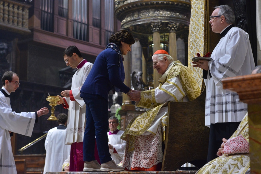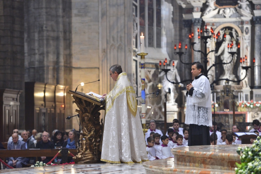 È la mattina della Pasqua di Risurrezione del Signore e, tra le navate della Cattedrale, i fedeli ne cantano la gioia, partecipando al solenne Pontificale presieduto dal Cardinale Arcivescovo cui sono accanto una ventina di sacerdoti, tra cui i membri del Capitolo metropolitano. I Dodici Kyrie della Liturgia ambrosiana, i gesti liturgici, le tre Letture tratte dal Nuovo Testamento – attraverso pagine degli Atti degli Apostoli, della I Epistola ai Corinzi e del Vangelo di Giovanni –, definiscono «la realtà della vita nuova di Gesù che i primi discepoli hanno sperimentato di persona», nota subito il cardinale Scola «Il fatto che il Risorto si sia fatto vedere è l’esperienza che introdurrà la Chiesa, quindi anche noi, nella novità della Pasqua di Gesù vivo oggi, qui ed ora».