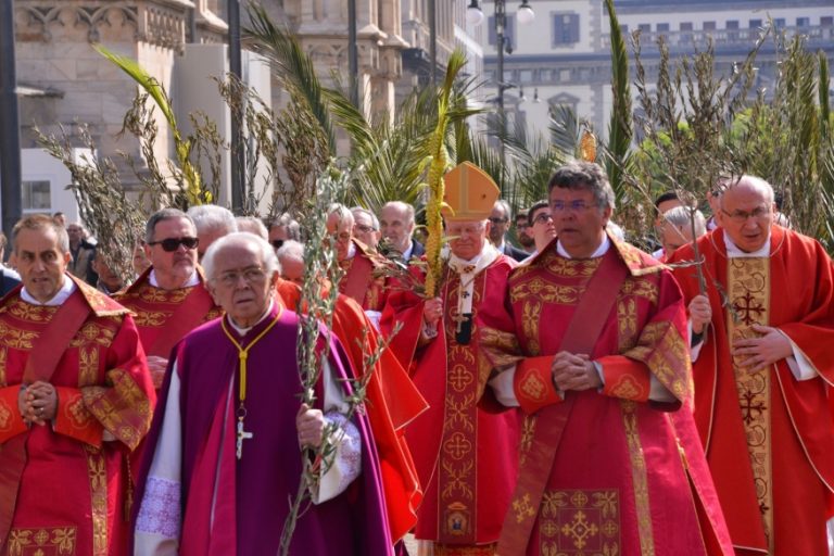 È la domenica delle Palme e, dopo aver benedetto gli Ulivi e le Palme davanti alla chiesa di Santa Maria Annunciata in Camposanto, il cardinale Scola muove in processione verso il Duomo con i Canonici del Capitolo Metropolitano, i rappresentanti degli antichi Ordini cavallereschi e delle Confraternite, seguito dalla gente, moltissima, con tanti bambini e intere famiglie. Tra loro i ragazzi e i piccoli, con i loro genitori, educatori e insegnanti, delle scuole paritarie “La Zolla” di Milano, che l’Arcivescovo ringrazia all’inizio della sua omelia, in questa grande Celebrazione che è “portale” di ingresso alla Settimana Santa, non caso, definita dal Rito ambrosiano, «Autentica» per la sua centralità nella vita cristiana. Come duemila anni fa, nelle vie inondate di sole che portano alla Cattedrale della Milano del terzo millennio, c’è, infatti, ancora il Signore con le migliaia di fedeli che compiono l’ideale salita a Gerusalemme.