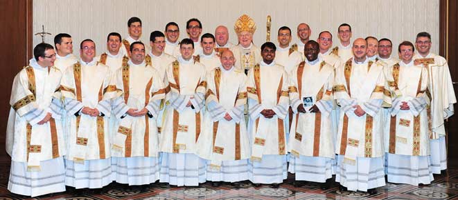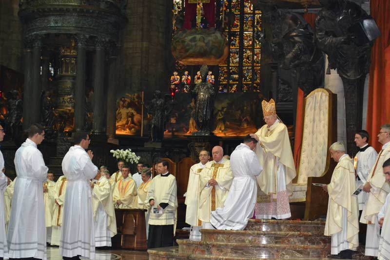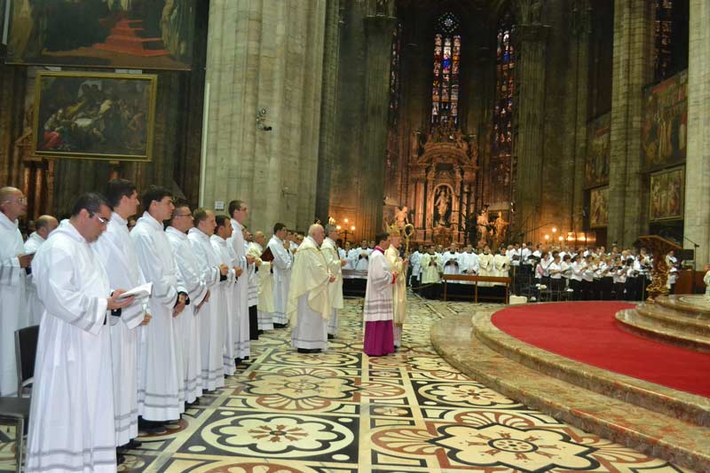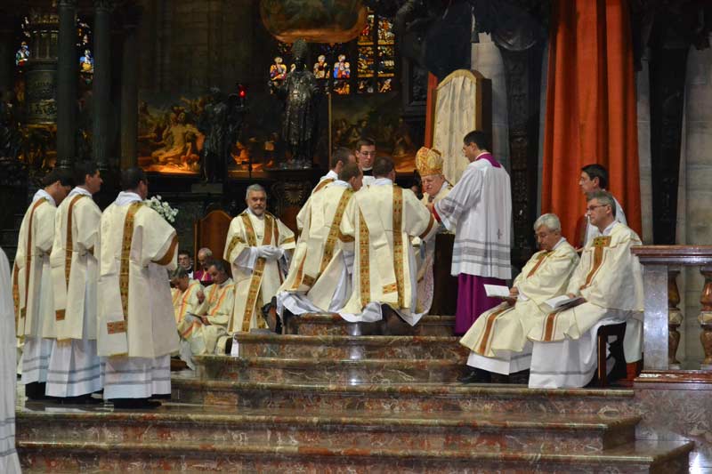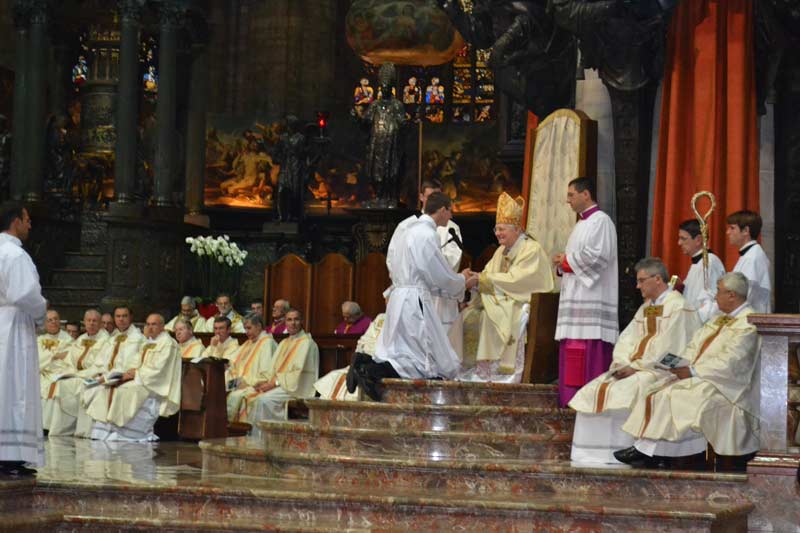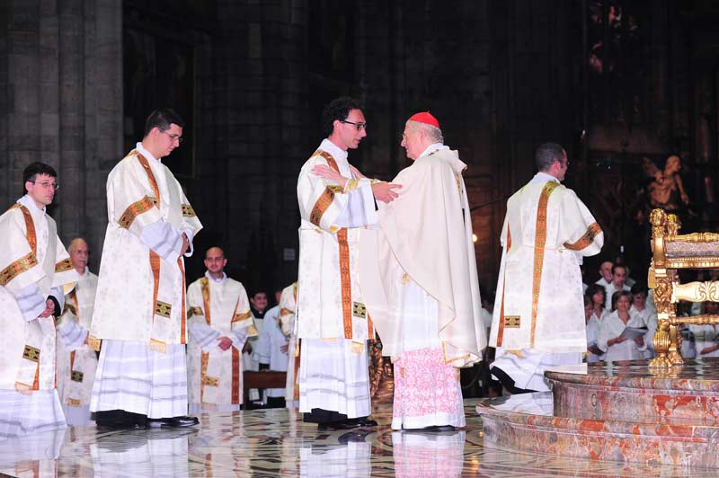 Nella festa dei Santi Arcangeli Michele, Gabriele e Raffaele il cardinale Scola ha conferito le ordinazioni diaconali a 29 ordinandi. Diciannove di loro erano giovani della diocesi, studenti di teologia presso il seminario di Venegono, il motto scelto dai candidati al sacerdozio, che li accompagnerà fino al giorno dell’ordinazione presbiterale, l’8 giugno 2013, è tratto dal Salmo 22 “Annuncerò il tuo nome ai miei fratelli”. Vi erano inoltre 3 giovani candidati al presbiterato dell’Istituto Missionario del Pime (Pontificio Istituto Missioni Estere): un italiano, un indiano e una camerunense. Dal 1990 nella Diocesi ambrosiana sono stati ordinati 120 diaconi permanenti. A questi, oggi se ne sono aggiunti altri 7, di cui 6 sposati e padri di famiglia, di età compresa tra i 50 e i 61 anni. Li accomuna il desiderio di mettersi al servizio della Chiesa, una missione che hanno voluto riassumere nel motto “Abbiate in voi gli stessi sentimenti di Cristo Gesù”.
