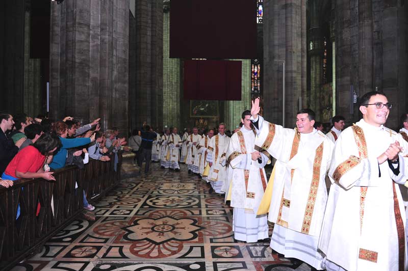 Concludendo la sua omelia, l’arcivescovo Angelo Scola, ha riecheggiato il celibato come sigillo dell’amore vero. «Cari candidati al presbiterato che oggi sarete ordinati diaconi, l’elezione che oggi la Chiesa fa delle vostre persone domanda alla vostra libertà un’altra imprescindibile condizione – ha detto il cardinale-. “Custodire per sempre l’impegno a vivere nel celibato”. In questo per sempre si trova il sigillo del vero amore. Questo dono che il Signore elargisce a ciascuno di voi è testimonianza luminosa dell’amore di Dio e della Sua potenza di compiere il desiderio del cuore dell’uomo».